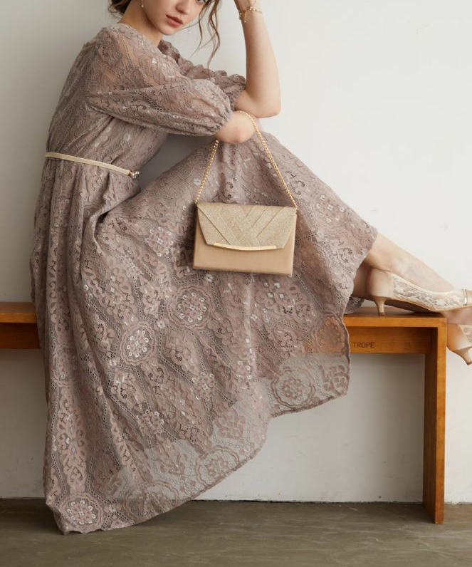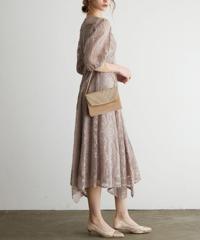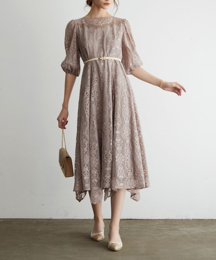 デコルテのレース使いやイレヘムデザインでオシャレ感もアップ。