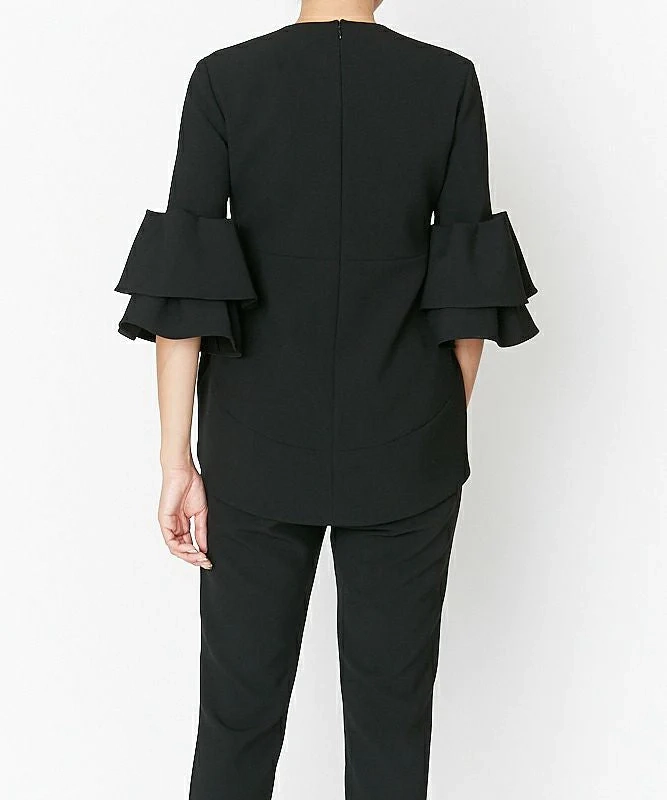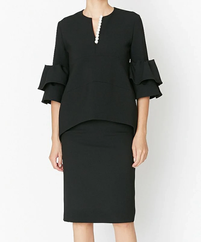 シャープな印象のスリットネックにパールをあしらったブラウス。程よい厚みとマットな質感の生地で仕立てており、袖口にはボリュームのある二段のフリルがデザインされた華やかさとクラス感が際立つ一着。