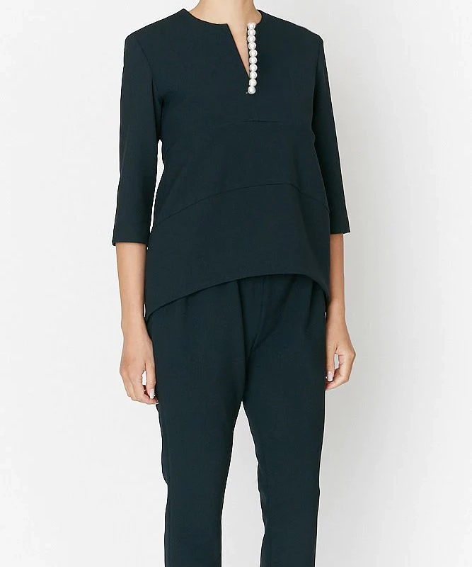 デコルテラインをすっきり美しく演出する深めのスリットラインに、YOKO CHANオリジナルのパールをあしらったパールスリットブラウス。