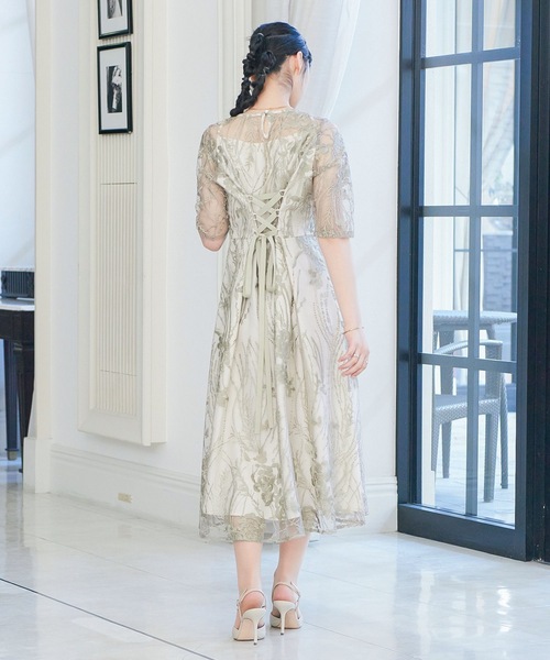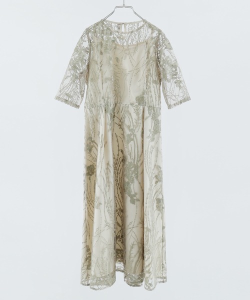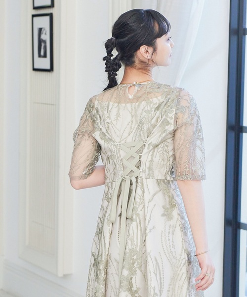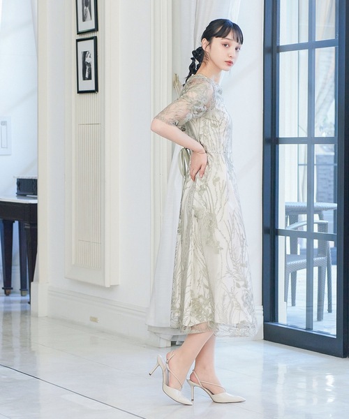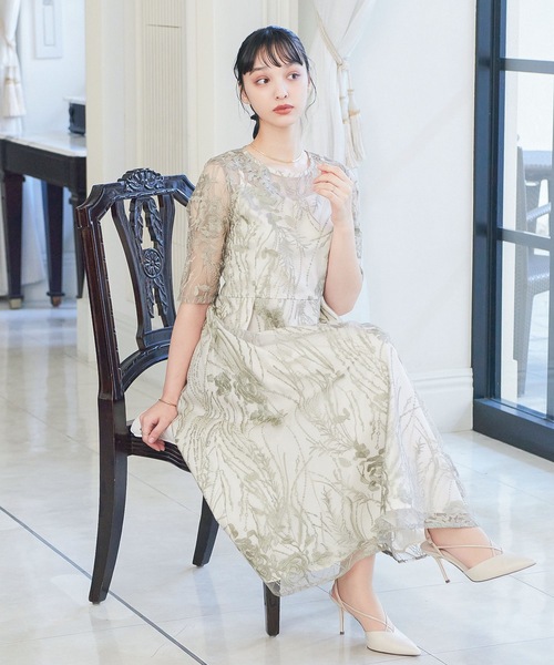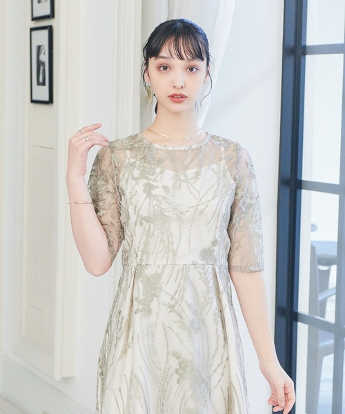 大柄な刺繍レースで甘くなりすぎない上品ドレスです。
