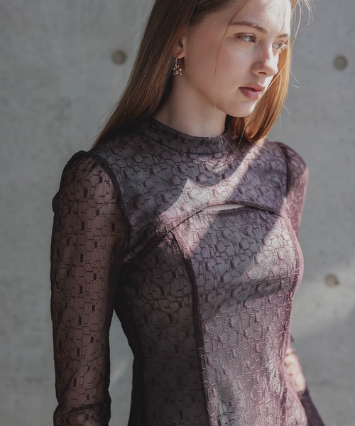 胸元のスリットは、女性らしさを引き立てるとともに、モードな雰囲気をプラスしています。