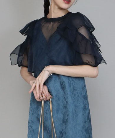 ジャガードのノースリーブワンピースと、フリルがあしらわれたボレロがセットになったアイテム。