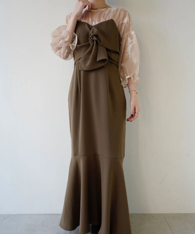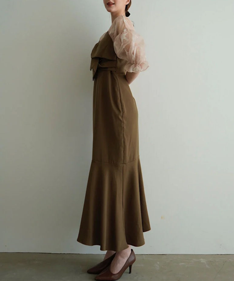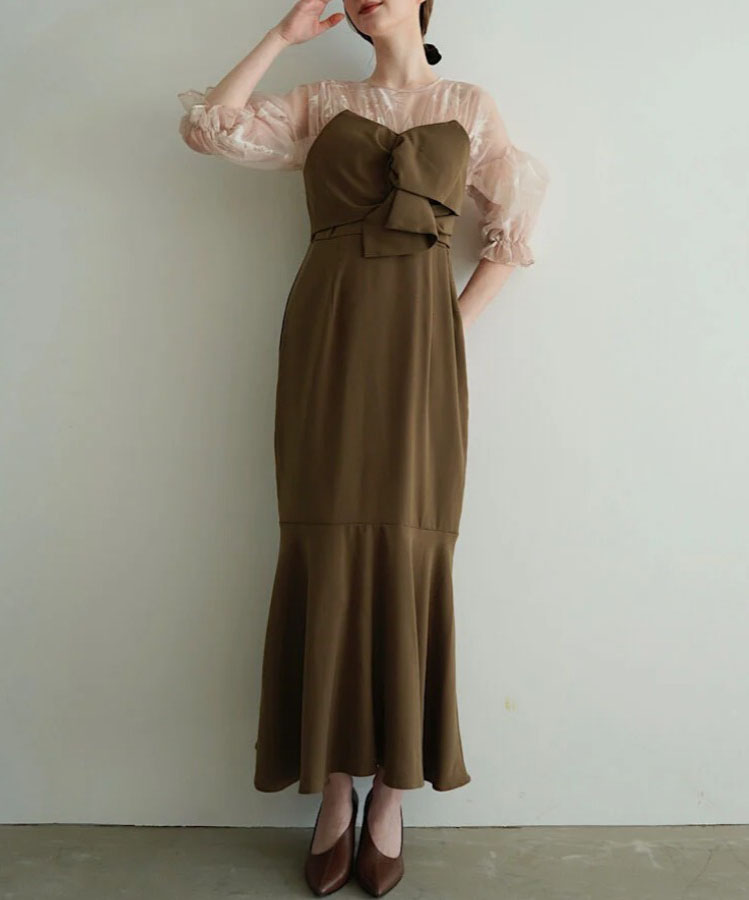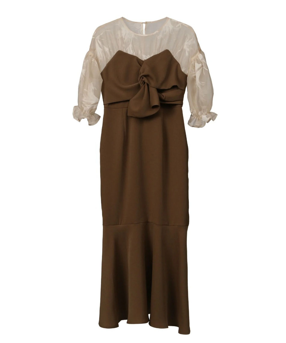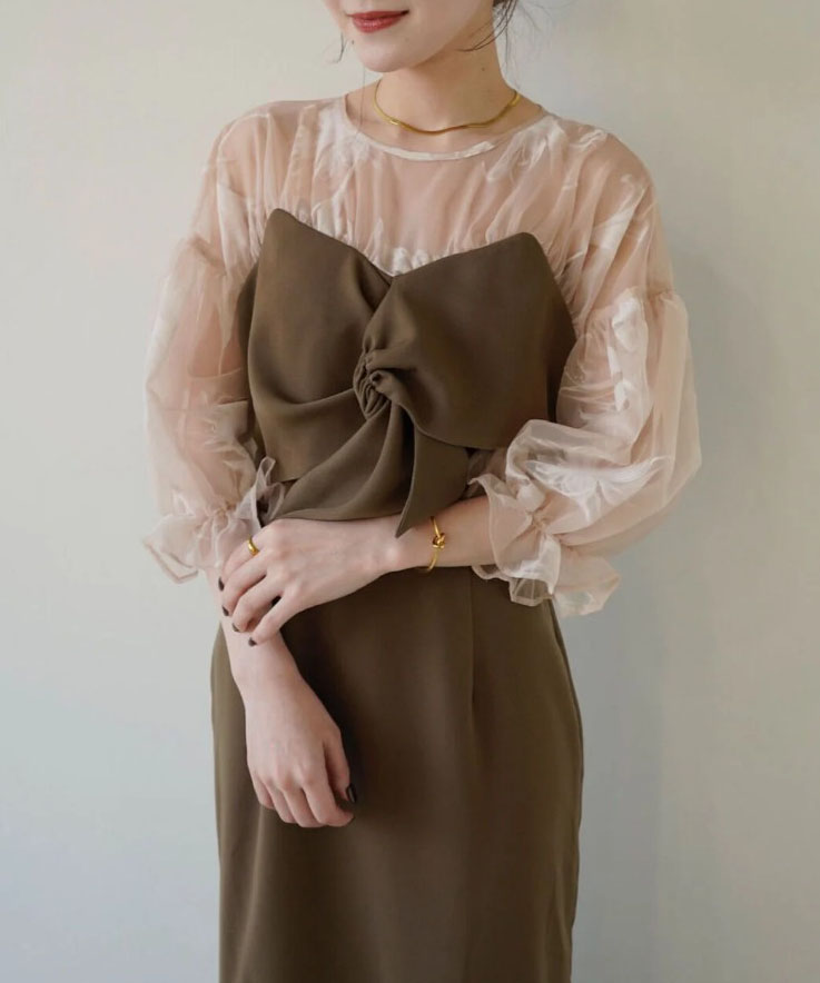 上品な透け感のある生地と組み合わせ、大人な印象に仕上がるワンピース。