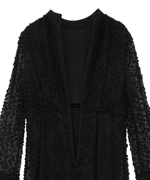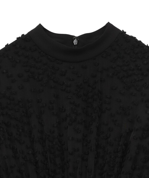 立体的なドットカットが特徴的なドレス。高めの位置のパイピングによりスタイルアップ効果あり◎。ナチュラルマーメイドシルエットで、袖は太幅のストレートだったり、少し高めのプチスタンドカラーがモードさもプラスしてくれるCLANEらしいデザインです。