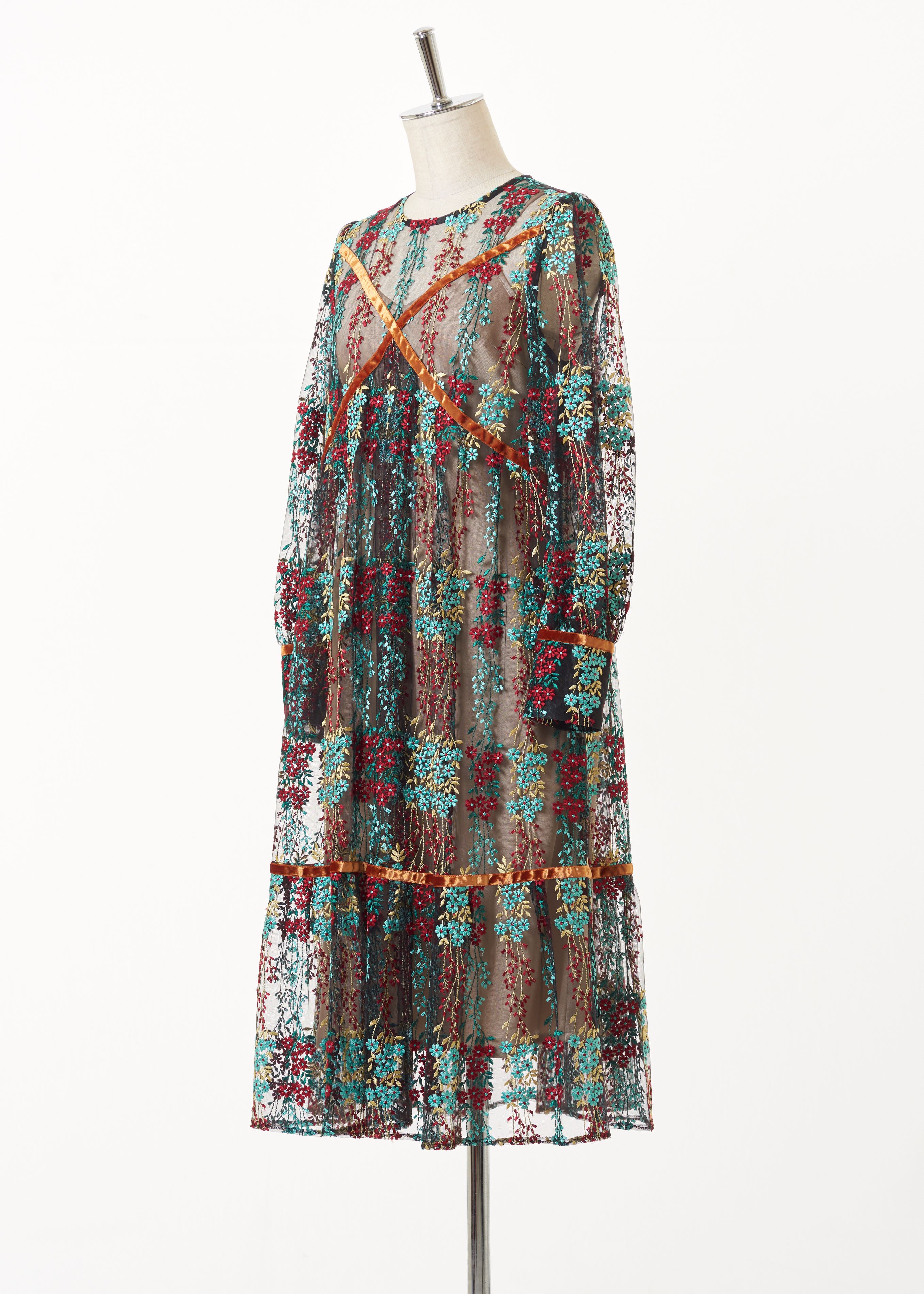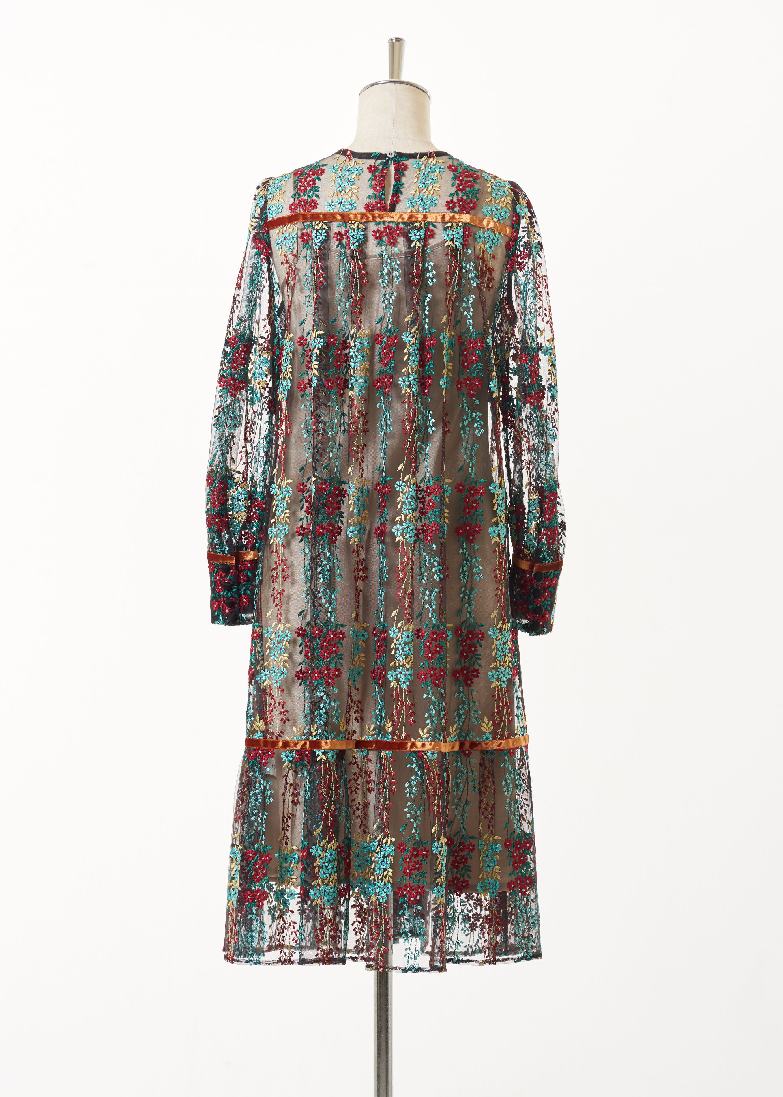 ノスタルジックな雰囲気のエンブロイダリーとフレアーシルエットでムードのあるワンピース。