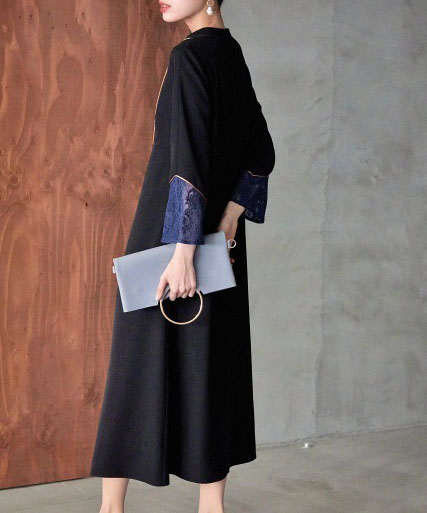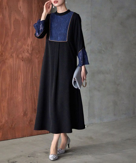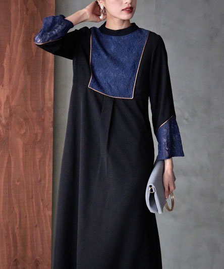 フロントレースと配色パイピング切替が大人可愛いモード感のあるワンピースドレスです。袖があるため二の腕をカバーしつつ、お洒落な雰囲気で、幅広い年代の方にご着用いただけます。