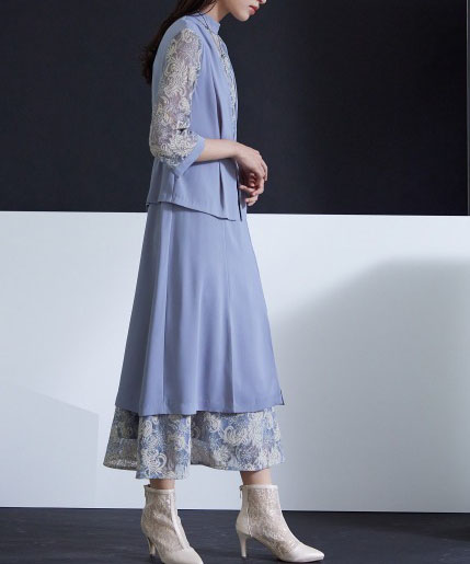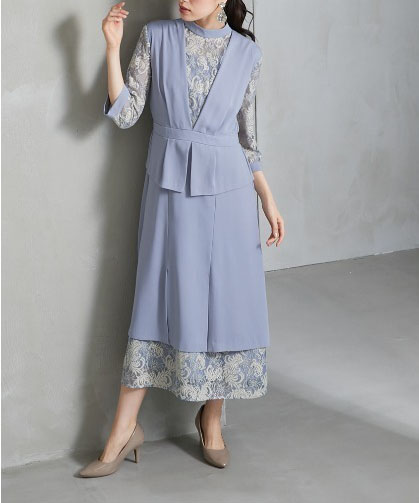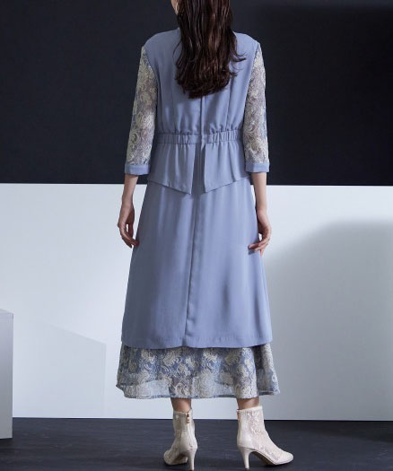 モード感のあるジャンスカ風ワンピースとレースを組み合わせたドレスです。袖があるため二の腕をカバーしつつ、お洒落な雰囲気で、幅広い年代の方にご着用いただけます。ウエストはゴム入りです。
