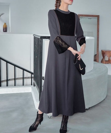 フロントレースと配色パイピング切替が大人可愛いモード感のあるワンピースドレスです。袖があるため二の腕をカバーしつつ、お洒落な雰囲気で、幅広い年代の方にご着用いただけます。