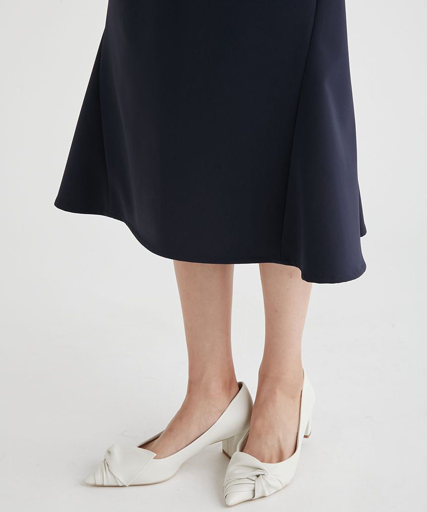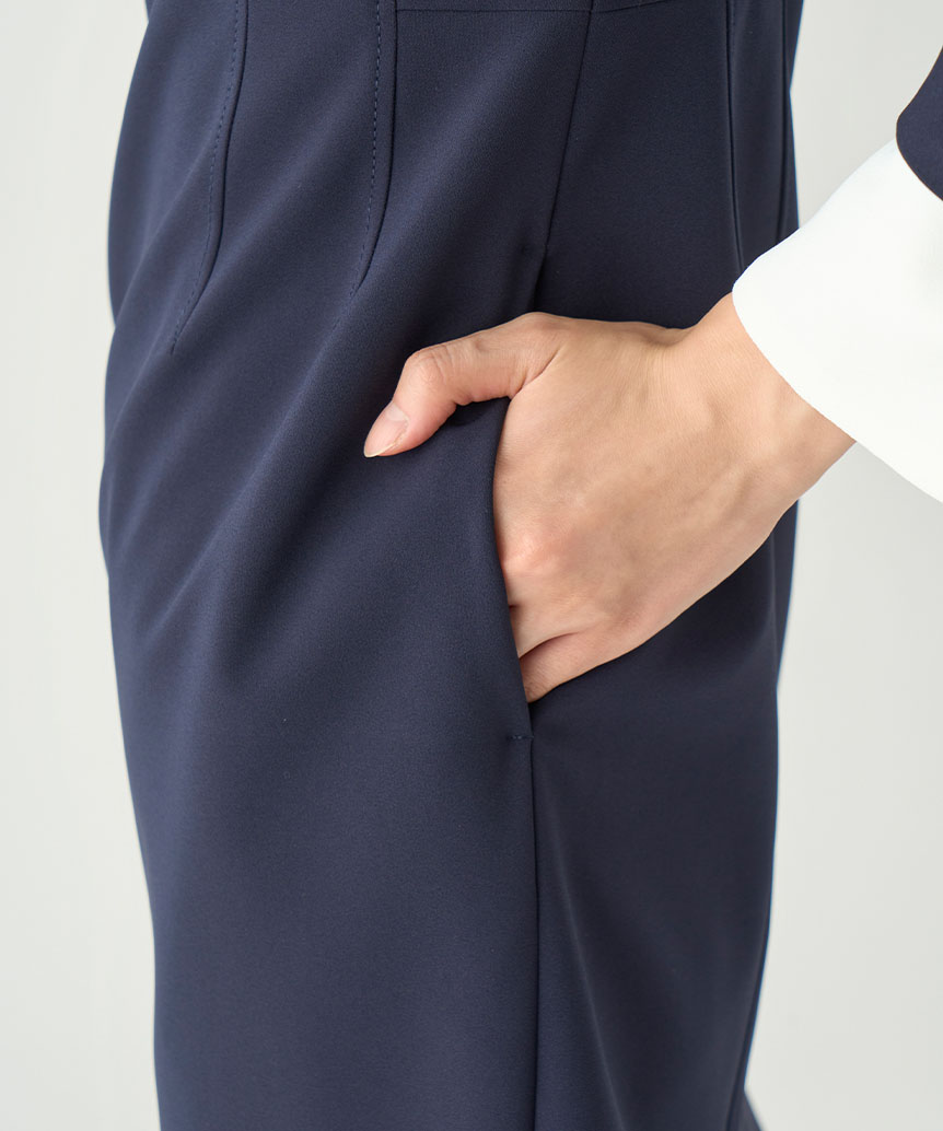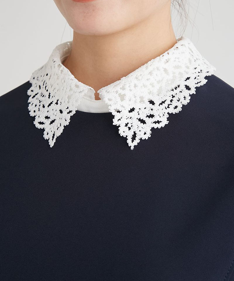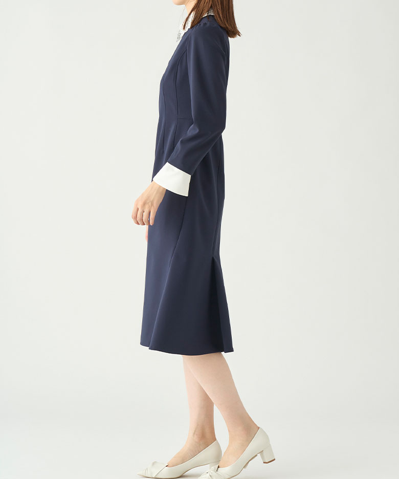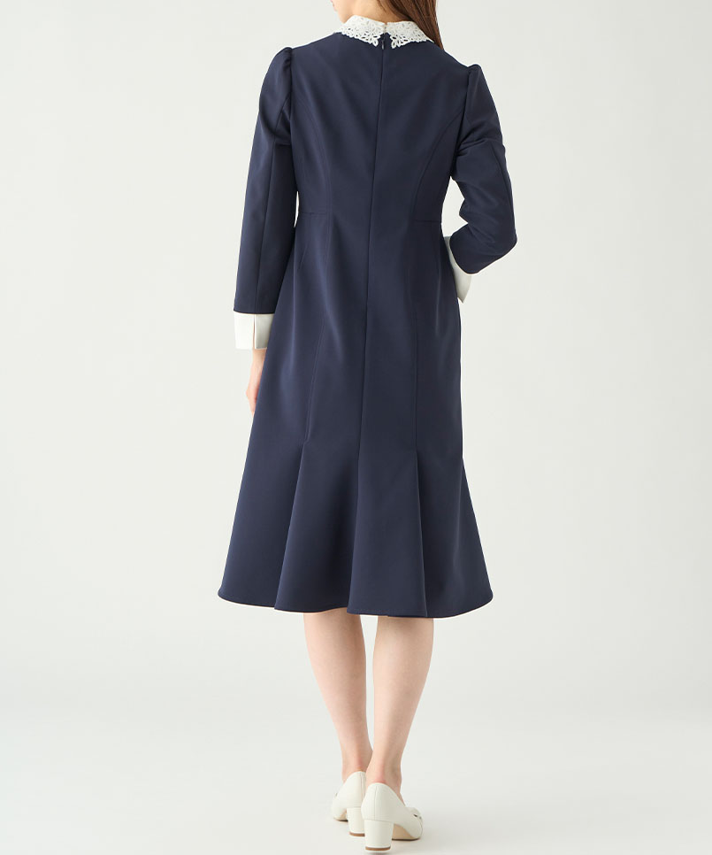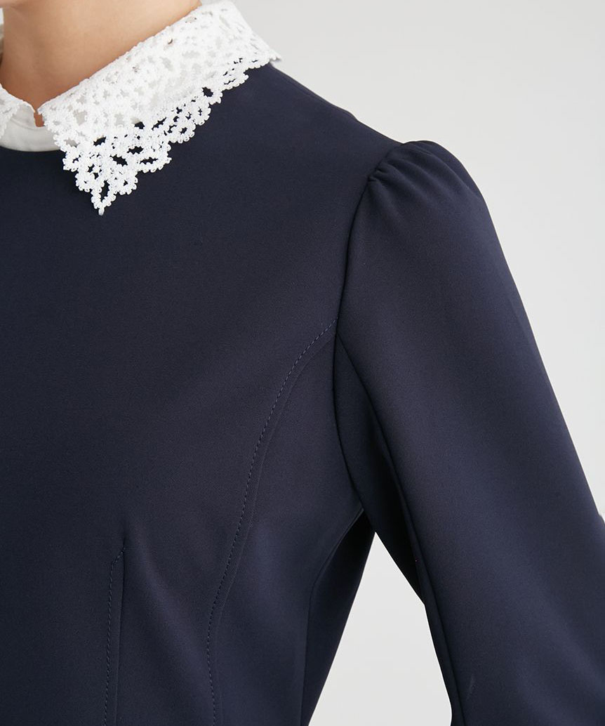 草花模様の刺繍襟で顔周りを華やかに優しい印象にしてくれます。ウストダーツとウエストダーツの位置で立体感を出し程よくタイトなデザインです。後ろの裾はマーメイドシルエットで、動くとエレガントな雰囲気に。襟とカフスは取り外し可能です。