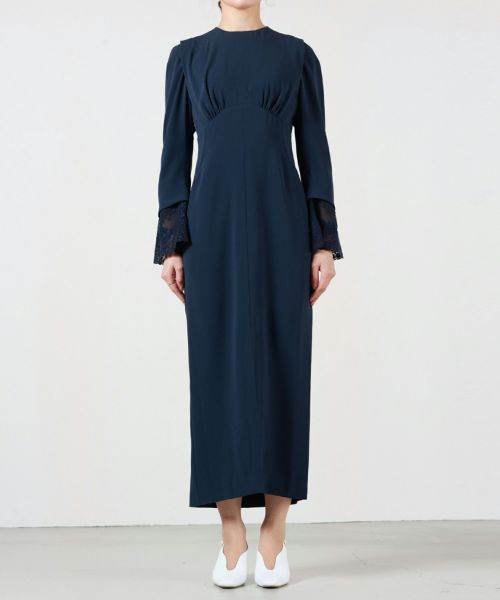 高めの位置でウエストをマークによる縦のラインを強調されているため、スタイルアップ効果抜群です。裾のスリットによるアクセントや袖のレースカフスによる手元の所作が美しい、ワンランクアップしたオケージョンドレスを叶えてくれます。