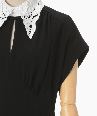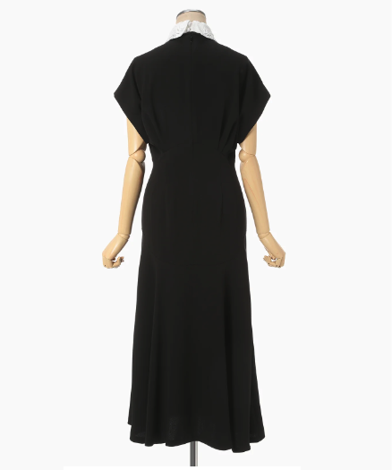 胸元のスリットがセンシュアルなアクセントをプラスするレースカラードレス。高めの位置でウエストをマークによる縦のラインを強調されているため、スタイルアップ効果抜群です。自立した襟の刺繍パーツは取り外し可能。二の腕をカバーするのが嬉しいポイント。