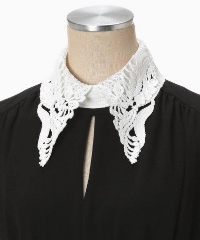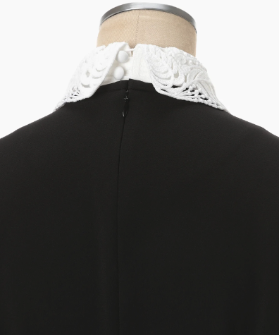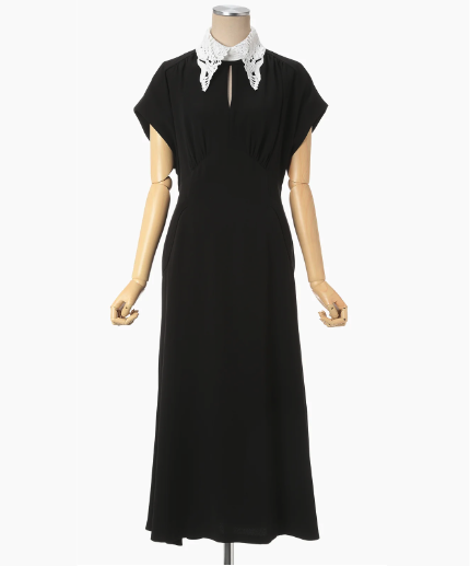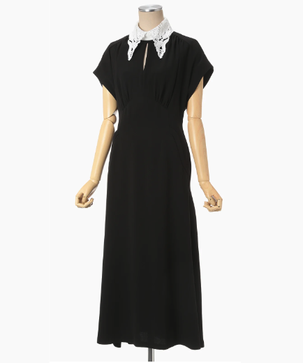 胸元のスリットがセンシュアルなアクセントをプラスするレースカラードレス。高めの位置でウエストをマークによる縦のラインを強調されているため、スタイルアップ効果抜群です。自立した襟の刺繍パーツは取り外し可能。二の腕をカバーするのが嬉しいポイント。