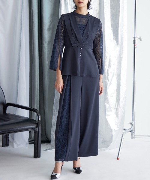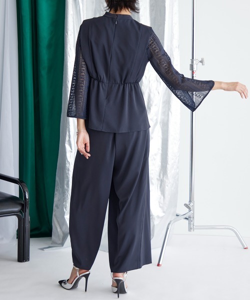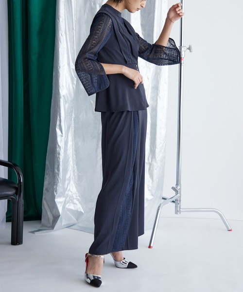アシメレースパンツがこなれた着こなしを演出してくれるワイドパンツのセットアップです。袖スリット入りで、ほどよい抜け感を演出してくれます。ウエストゴム入りで、窮屈さを抑えた仕様になっています。
