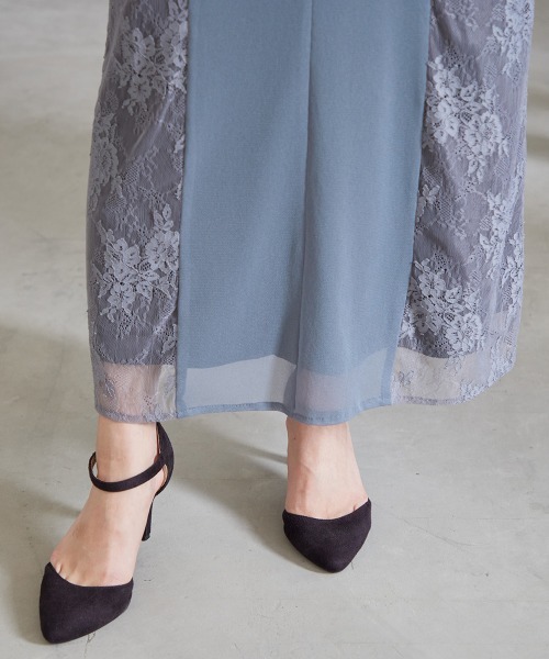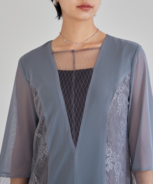 透け感のある異素材生地をドッキングしたエレガントなワンピースドレスです。Iラインのシルエットですっきりとした縦のラインを演出しているので、スタイルアップ効果があります。