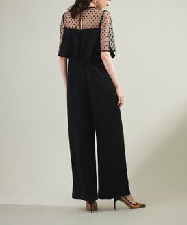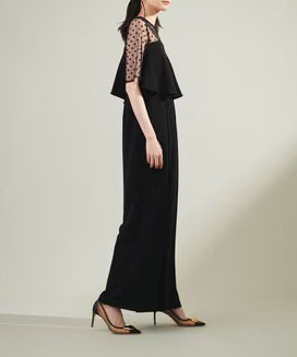 シアーな透け感が、大人っぽく上品な印象になるパンツドレスです。ゆったりとしたワイドパンツ型でリラックスして着て頂けます。