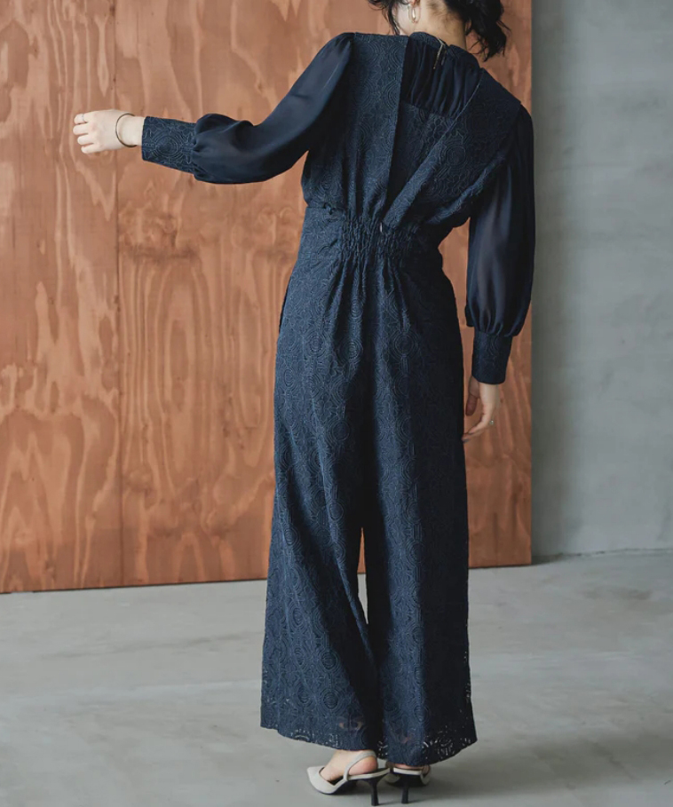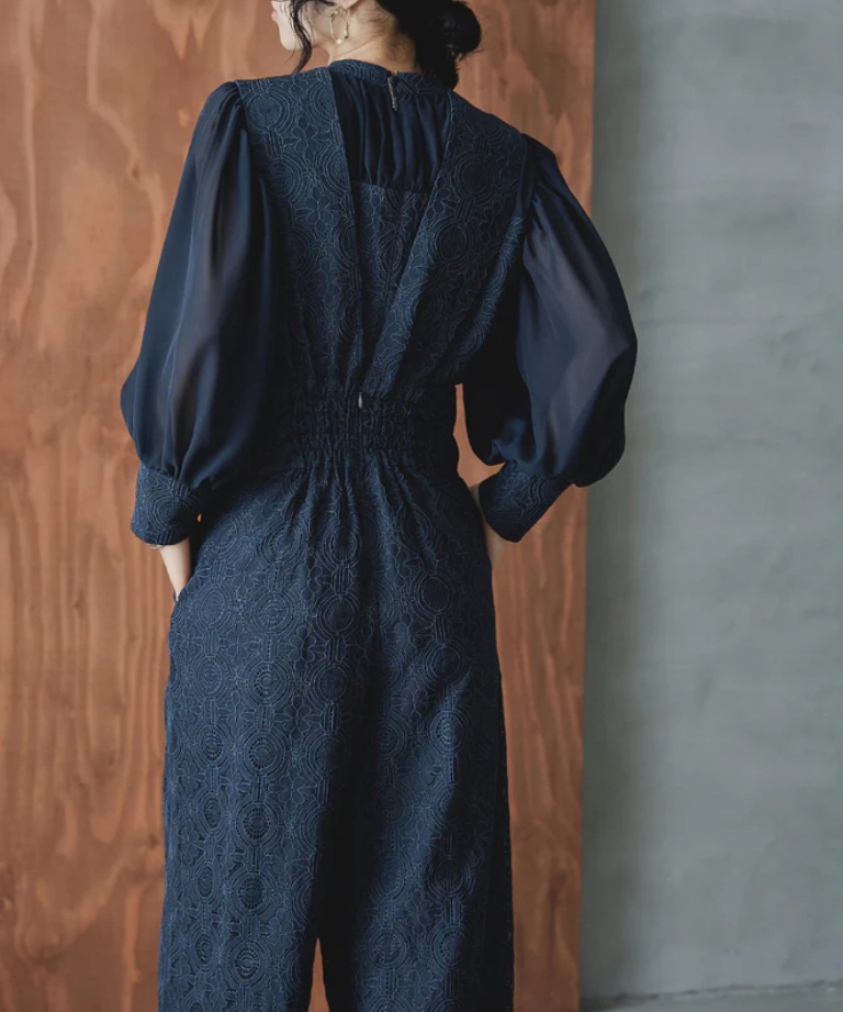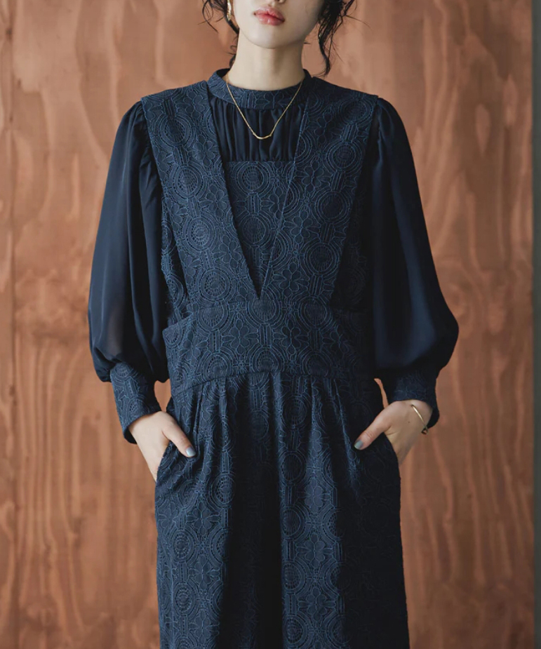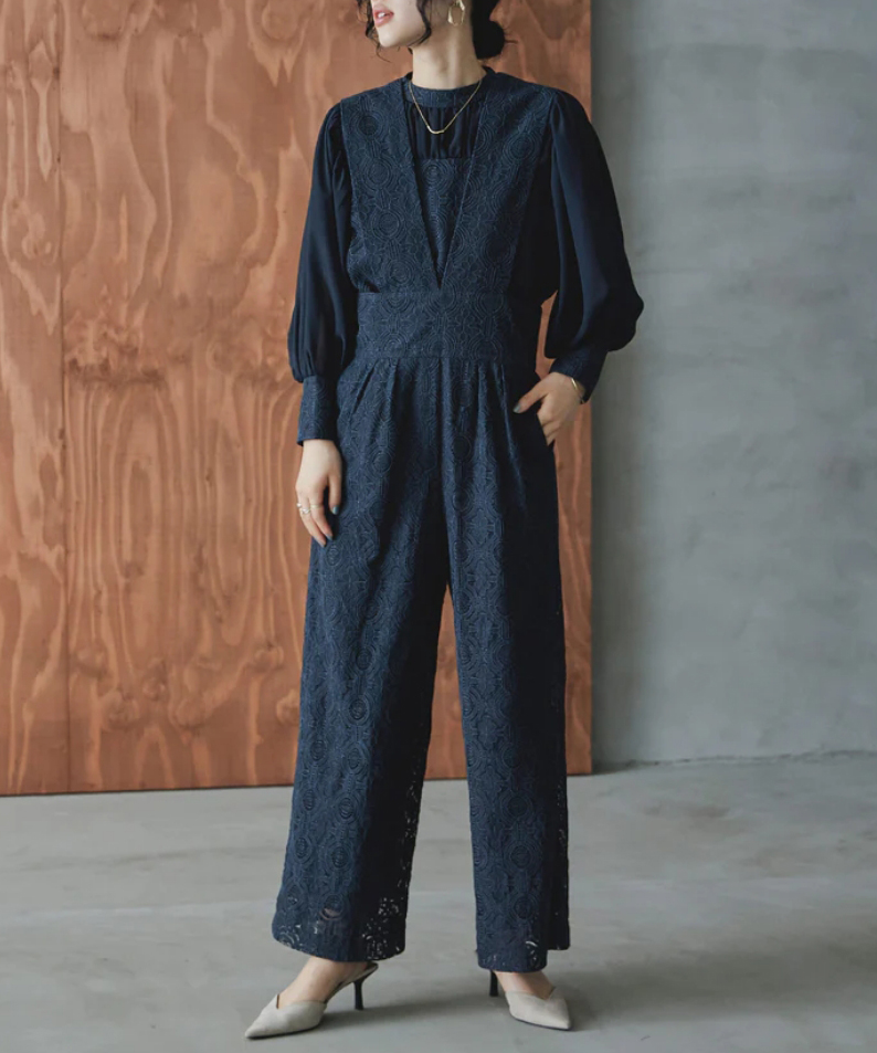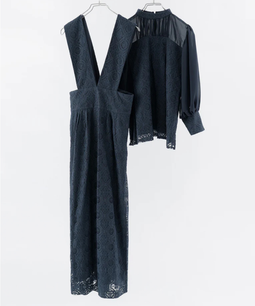 目を惹くレースを纏ったブラウスとサロペットのセットドレス。