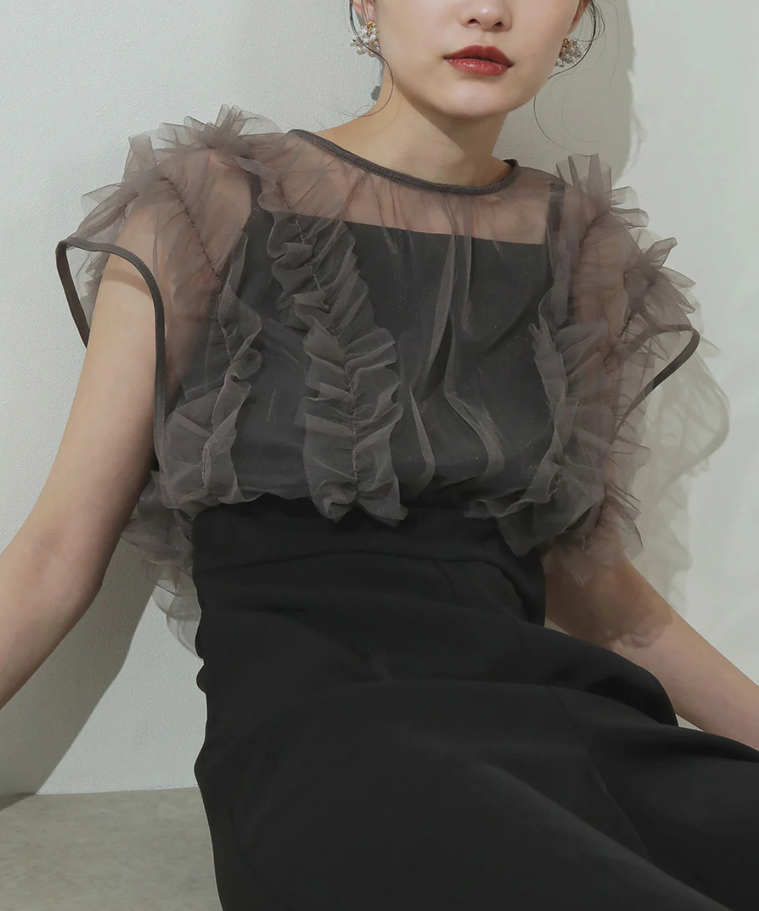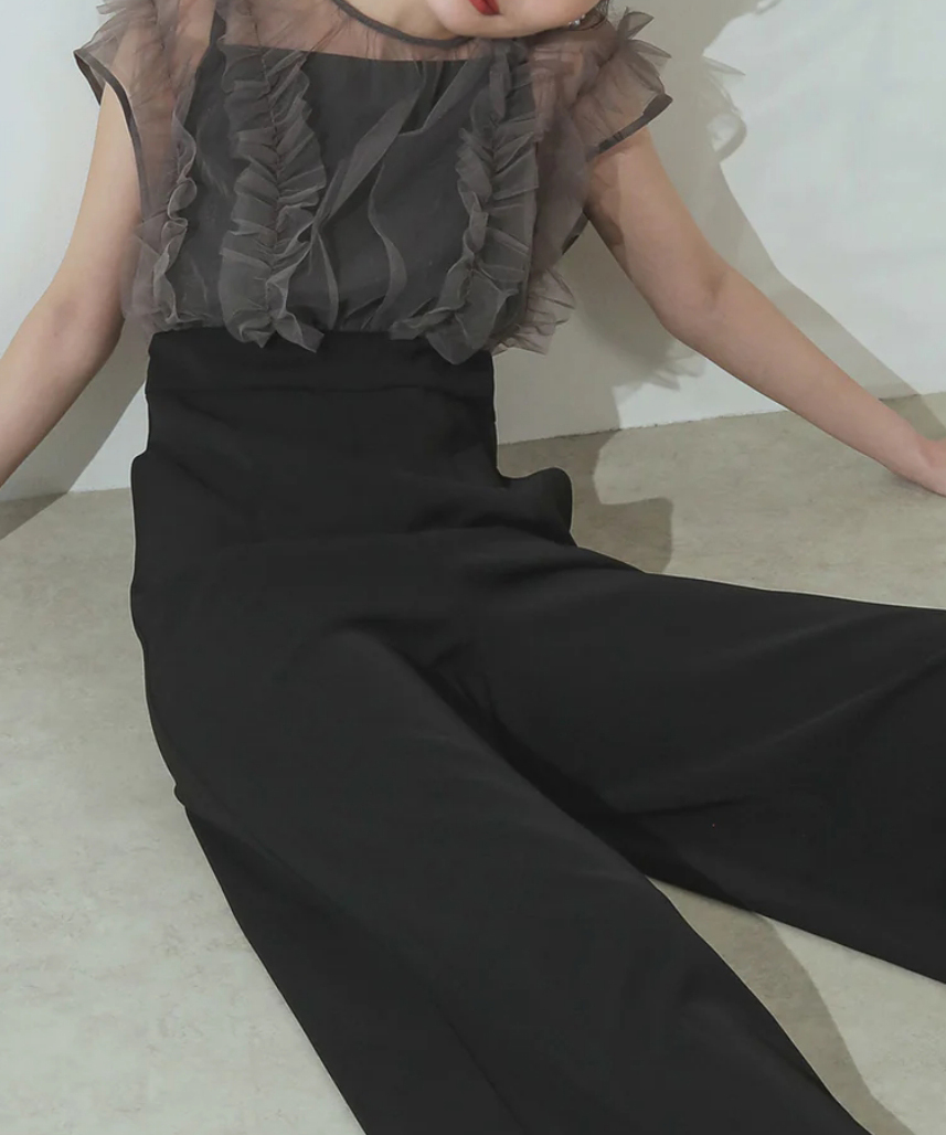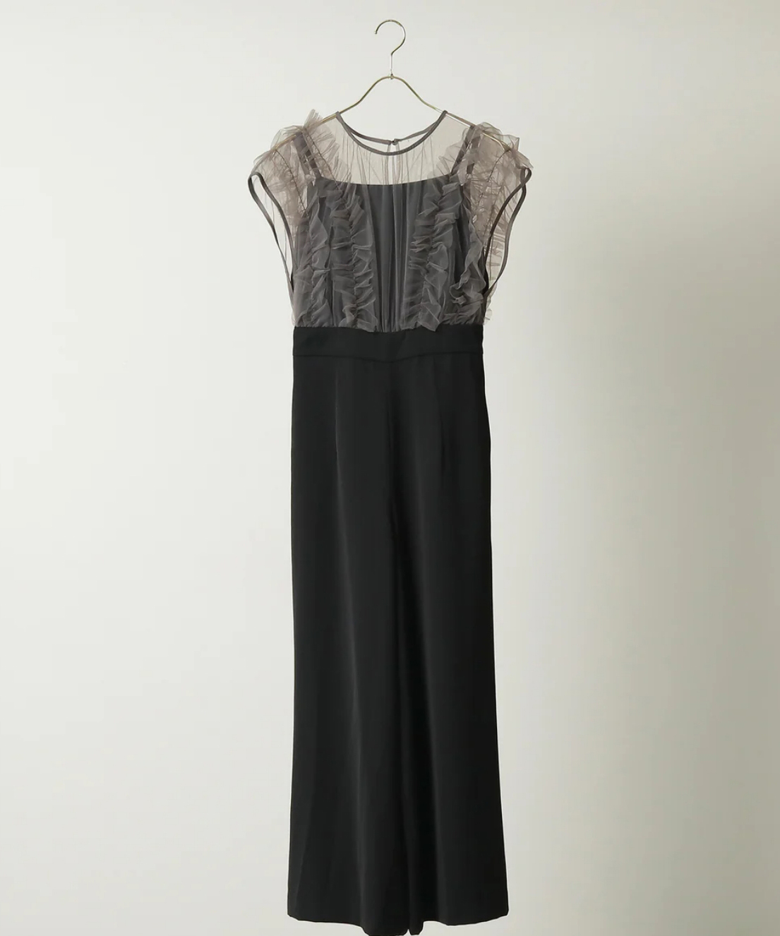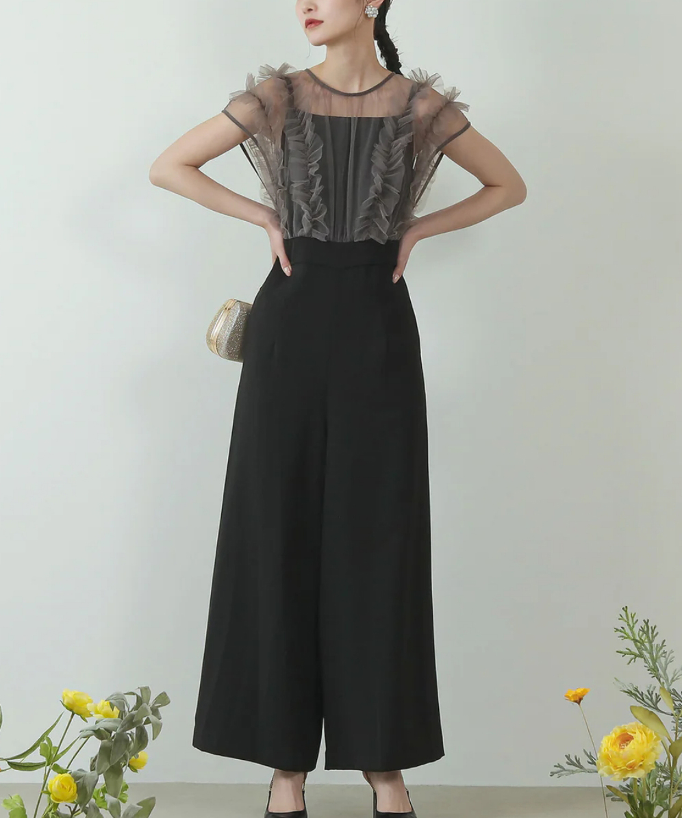 チュール生地とベース生地の配色がモダンで大人っぽさを演出するパンツドレス。