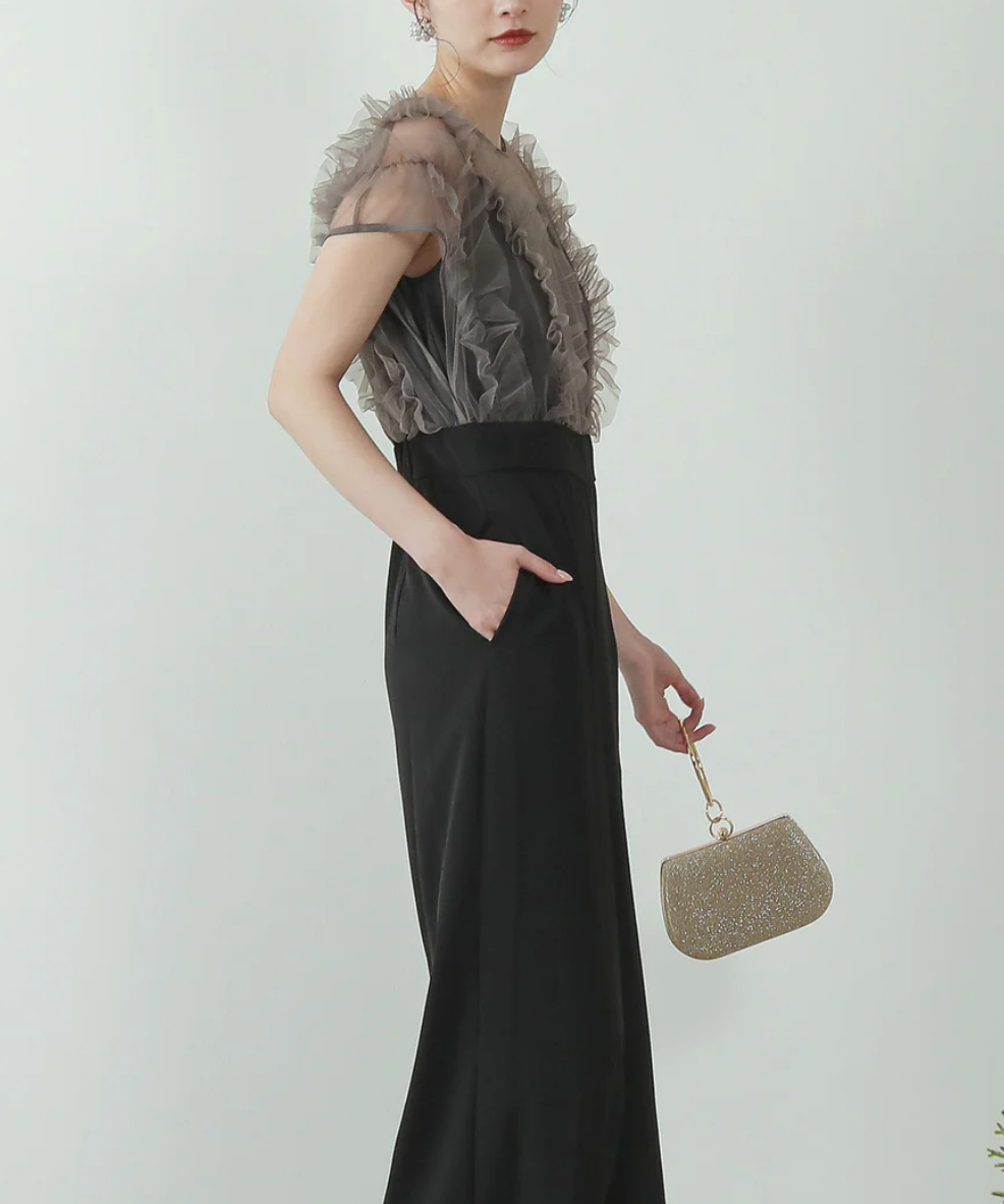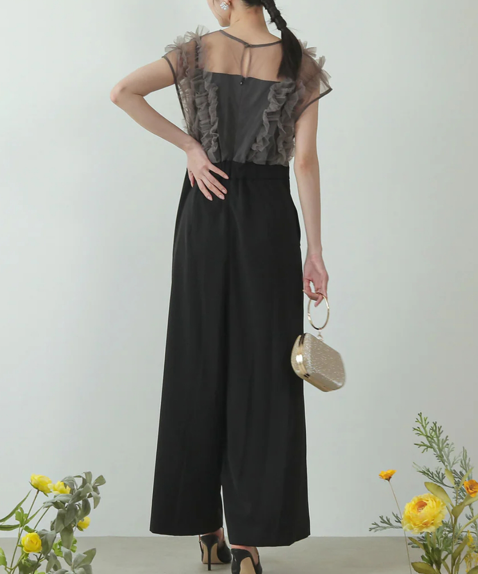 チュール生地とベース生地の配色がモダンで大人っぽさを演出するパンツドレス。