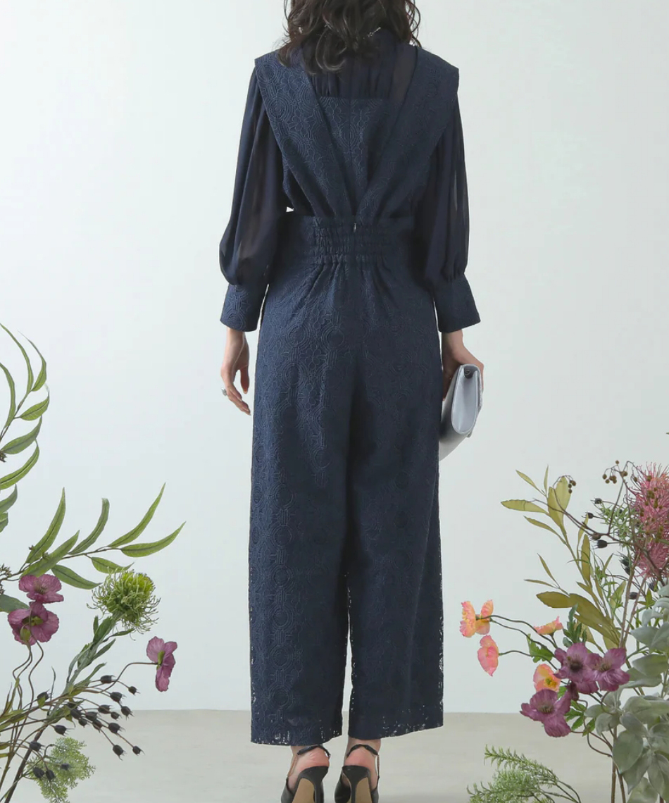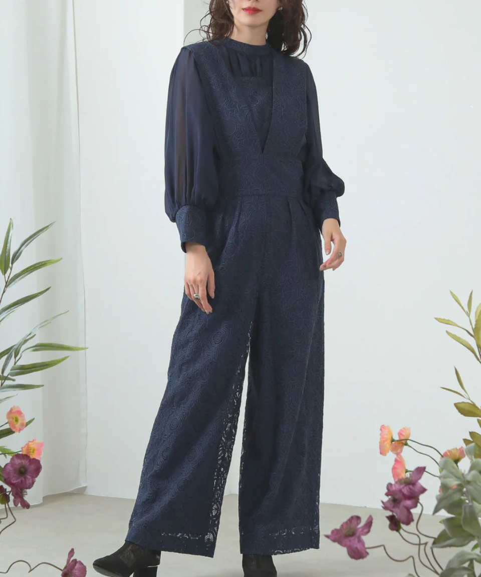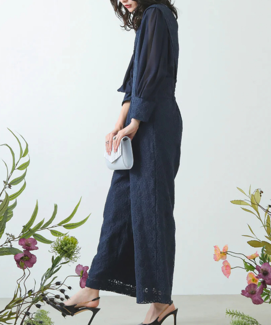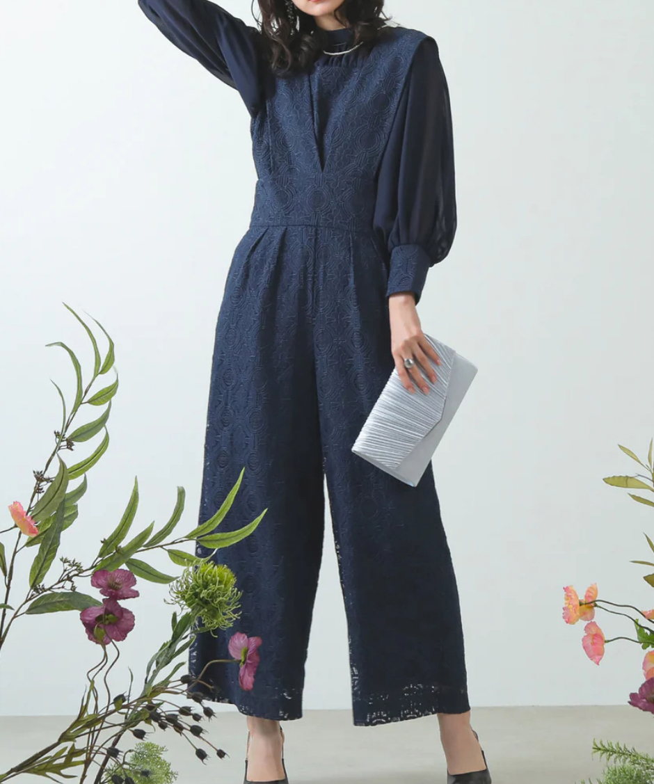 レトロムードな幾何学柄レースでスタイリッシュな印象のパンツドレス。