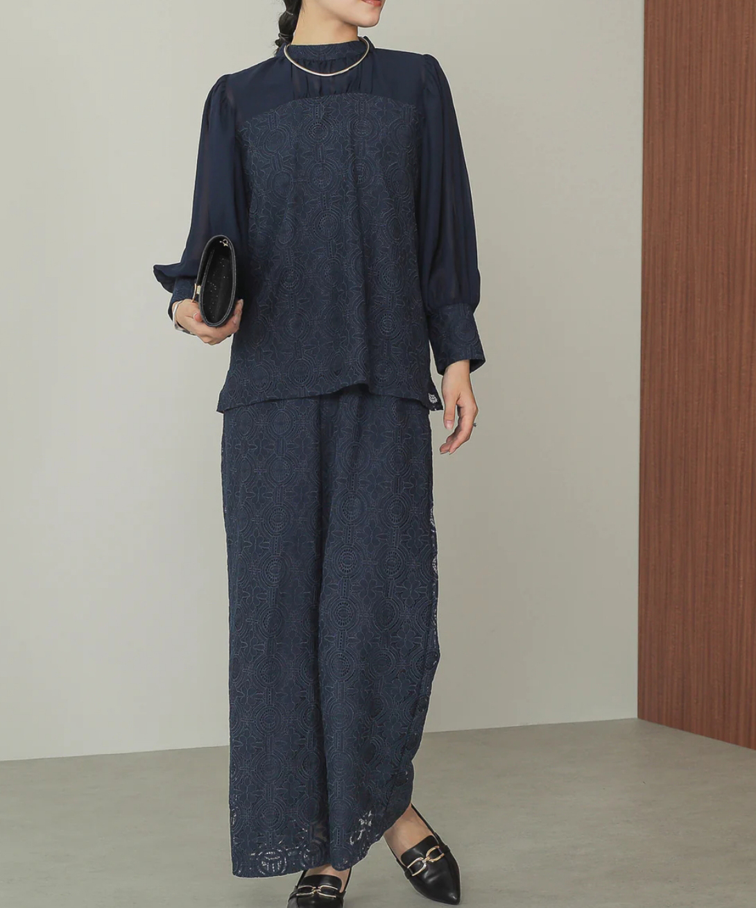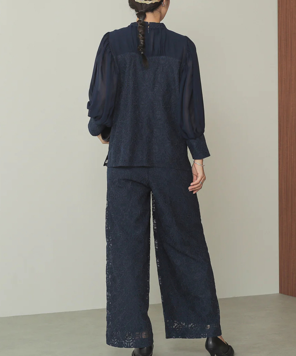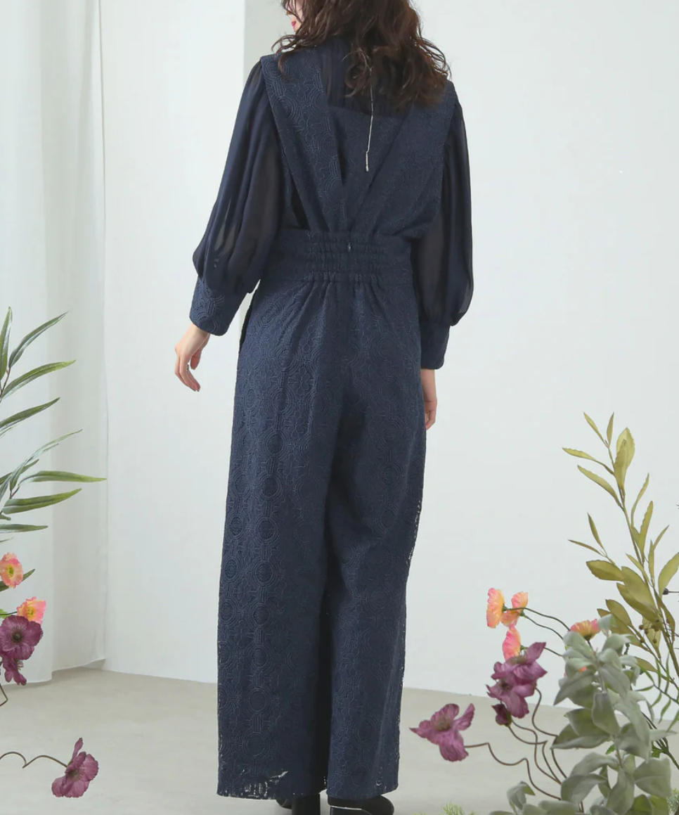 レトロムードな幾何学柄レースでスタイリッシュな印象のパンツドレス。