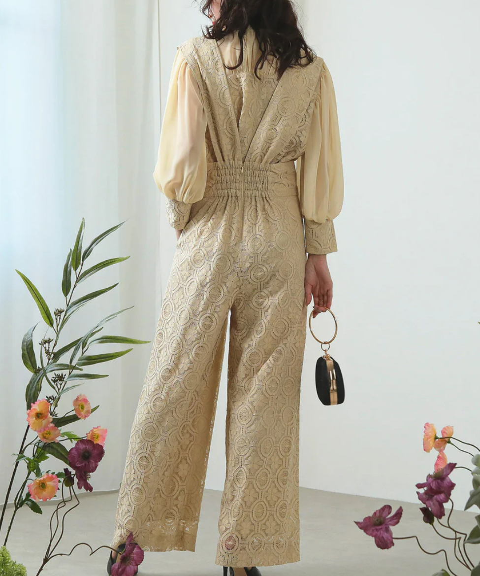 レトロムードな幾何学柄レースでスタイリッシュな印象のパンツドレス。