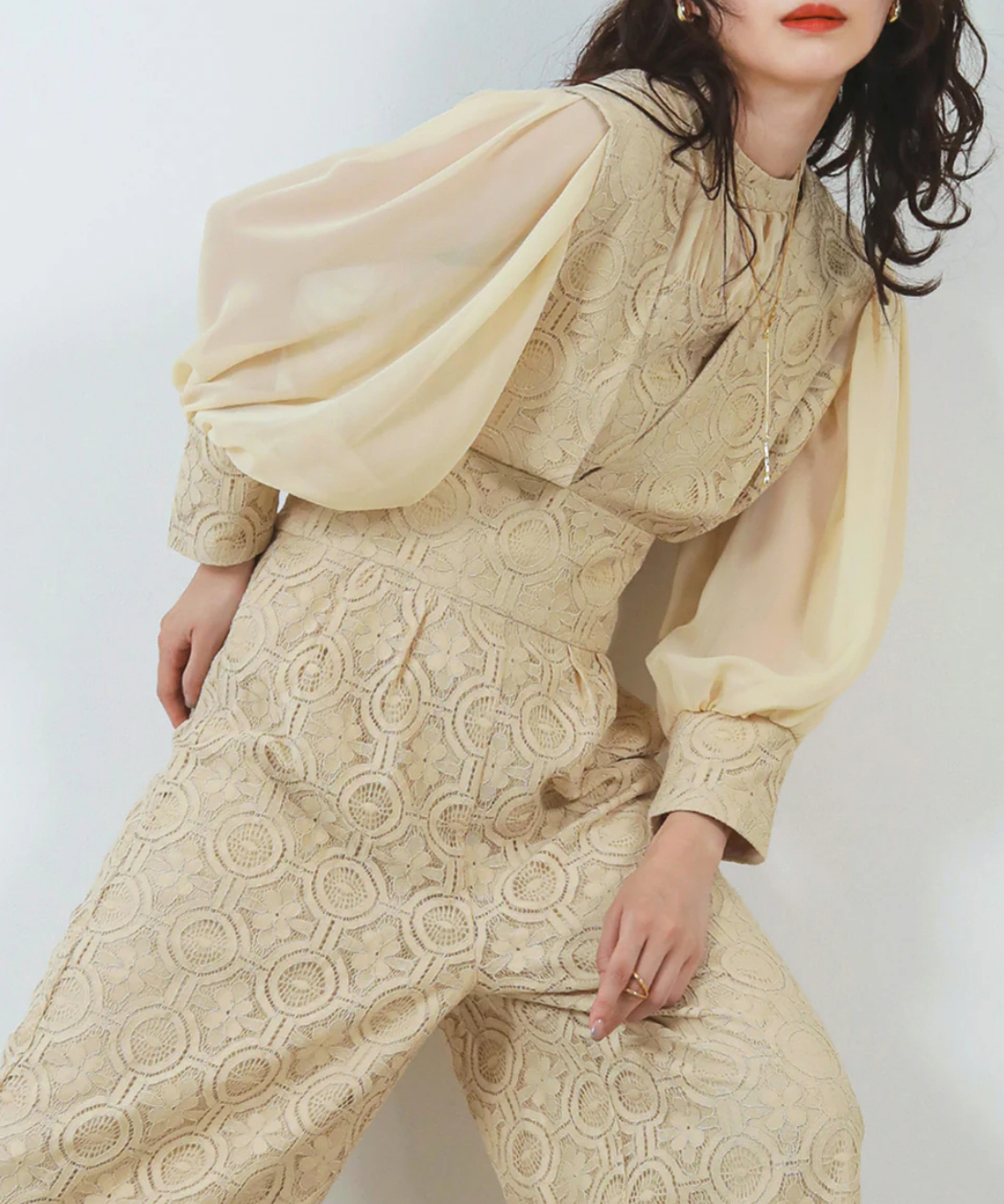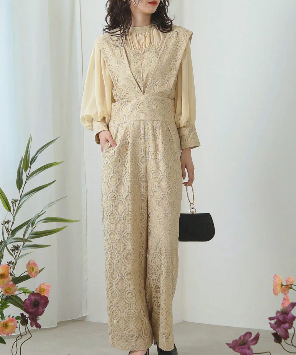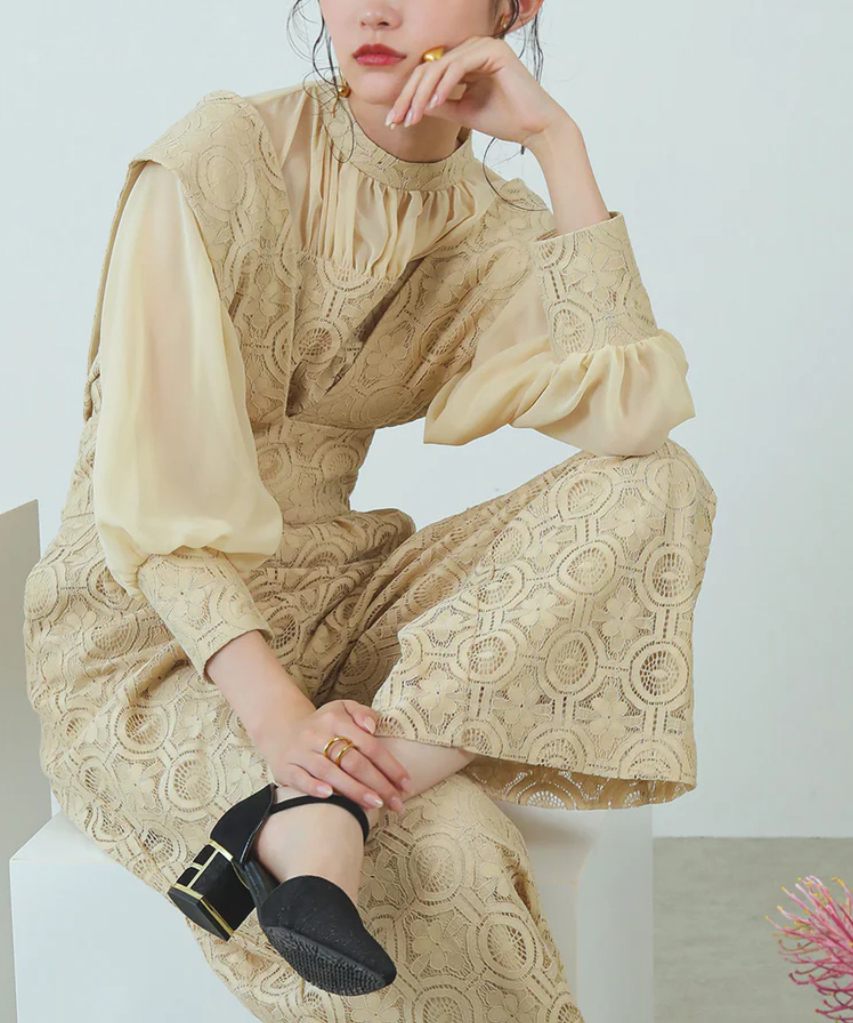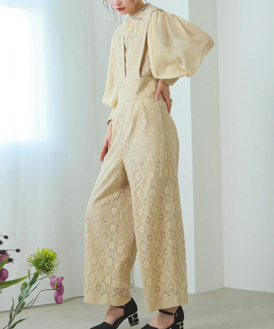 レトロムードな幾何学柄レースでスタイリッシュな印象のパンツドレス。