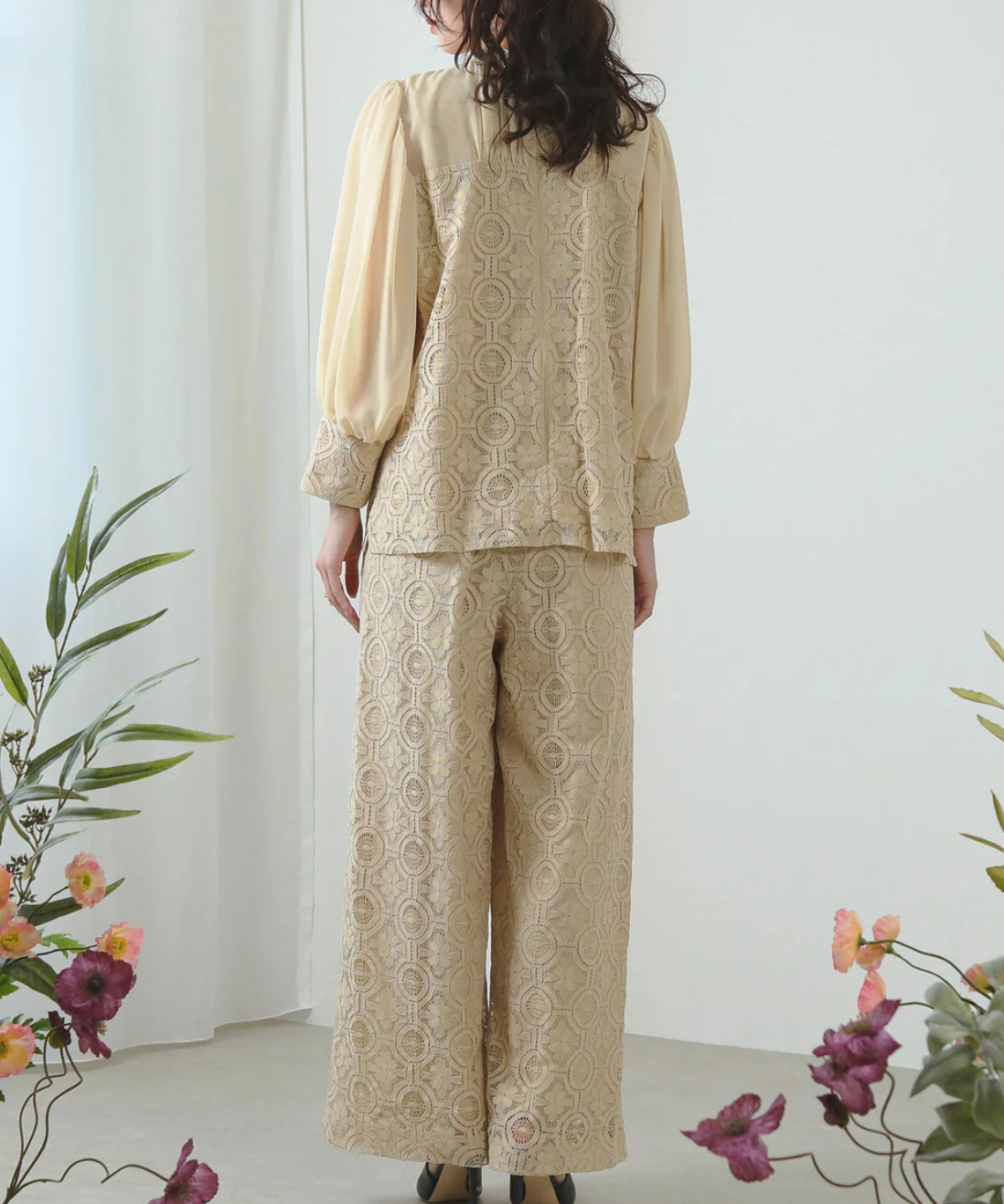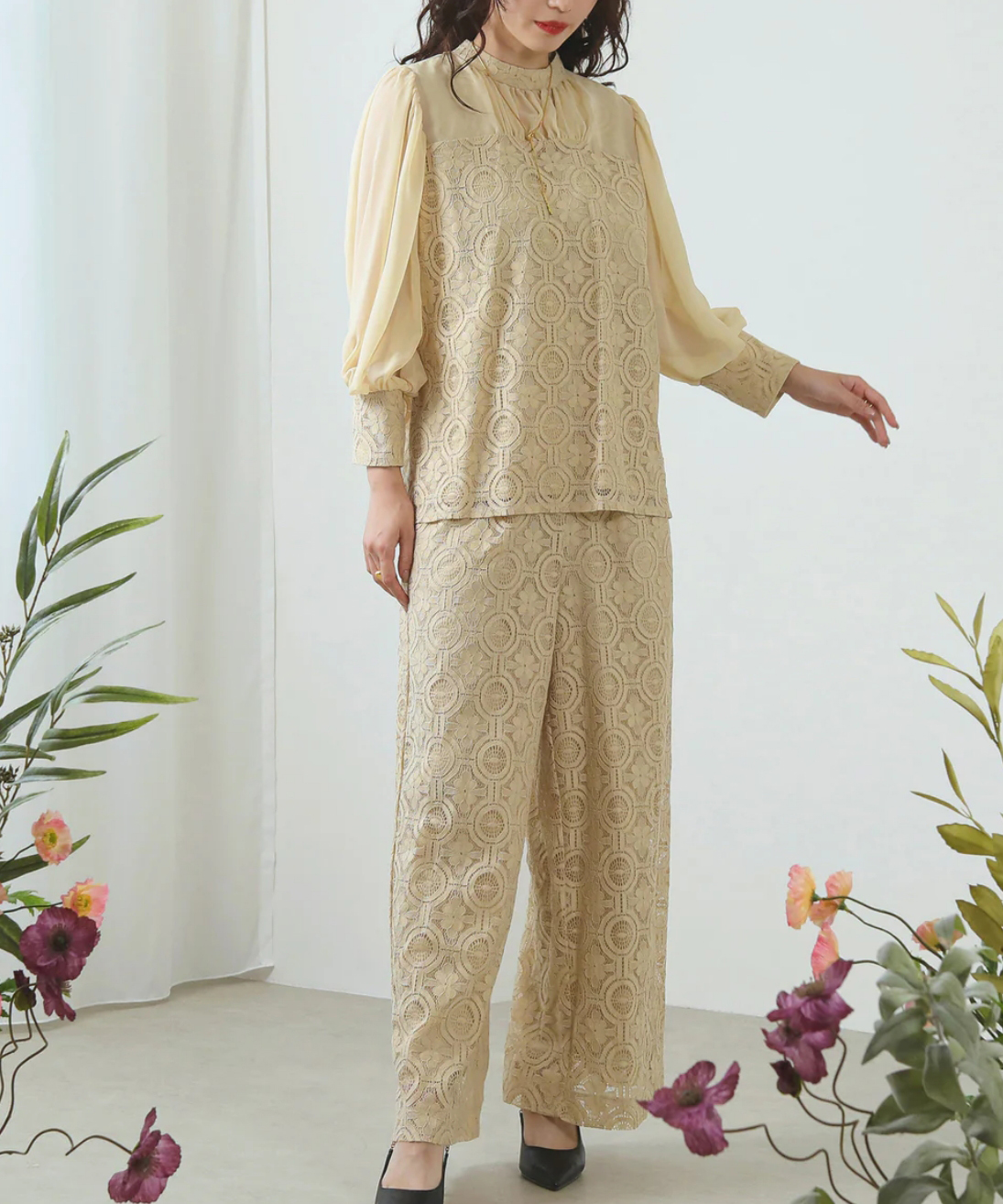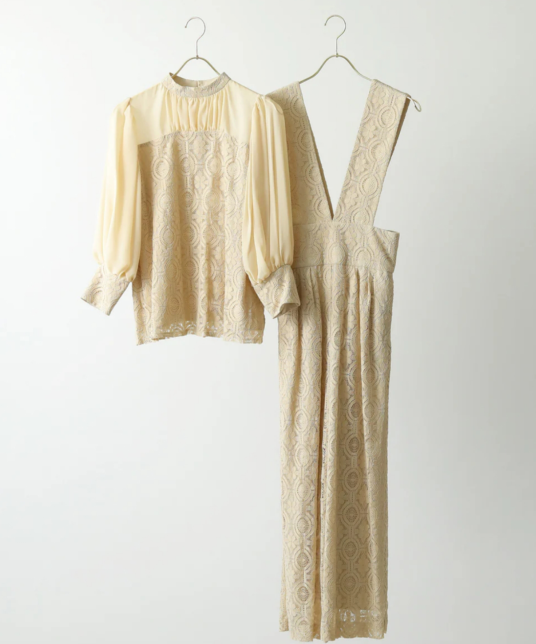 レトロムードな幾何学柄レースでスタイリッシュな印象のパンツドレス。