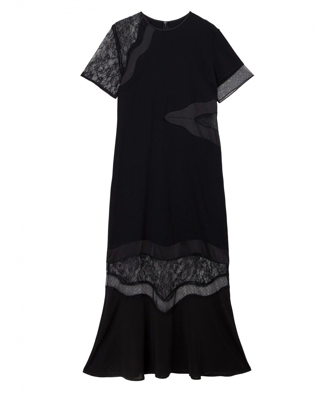 ドットチュールや花柄レース部分シアー感があり女性らしいドレスです。またウエスト部分はラインに沿った綺麗なシルエットが出るため、スタイルアップ効果があります。またカットソー素材のため、伸縮性があり、着心地抜群です。真夏にもサラッとご着用いただけます。綺麗めなカットソー素材のため、ブランド様からオケージョン着用を推奨されておりますが、格式高い式には不向きかもしれません。ヒールのある靴、パールのアクセサリーなどオケージョン向きのアイテムを合わせるのが◎。