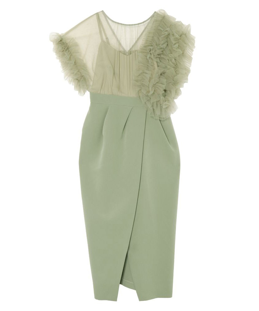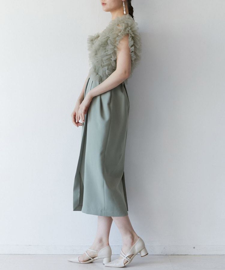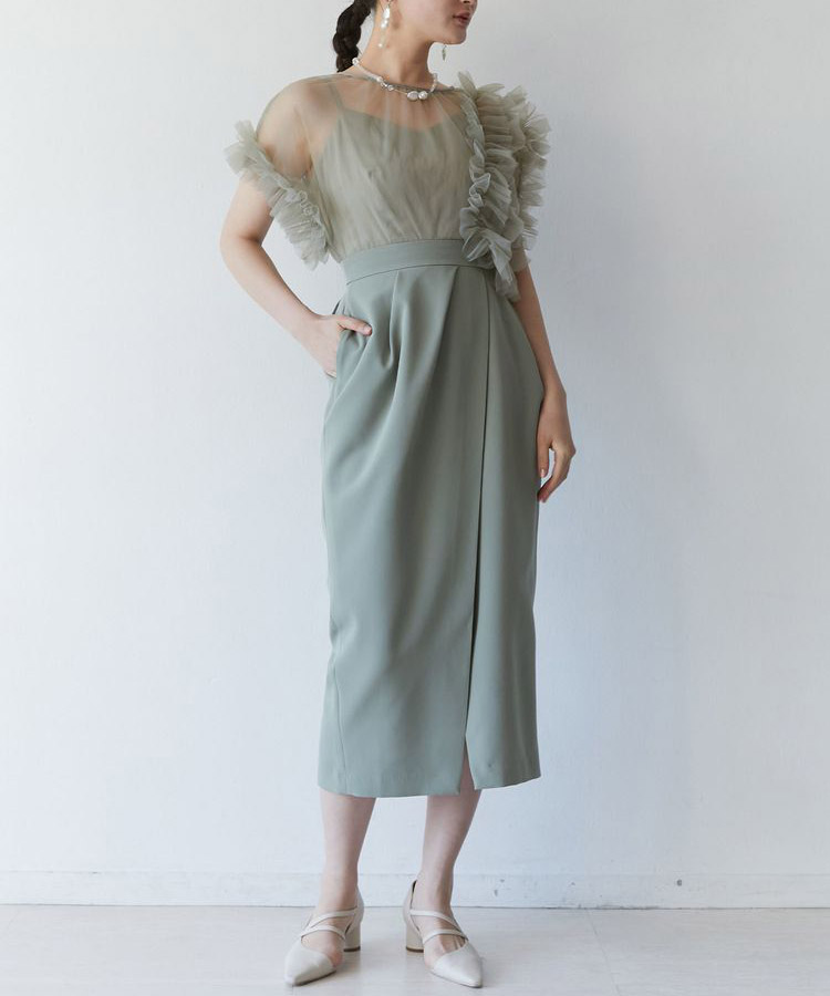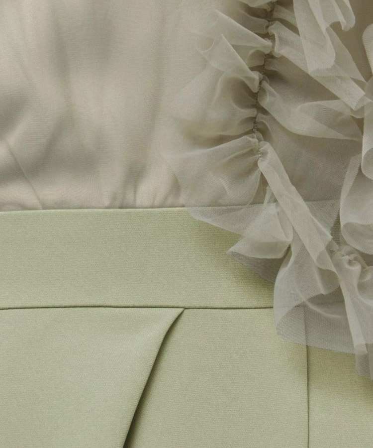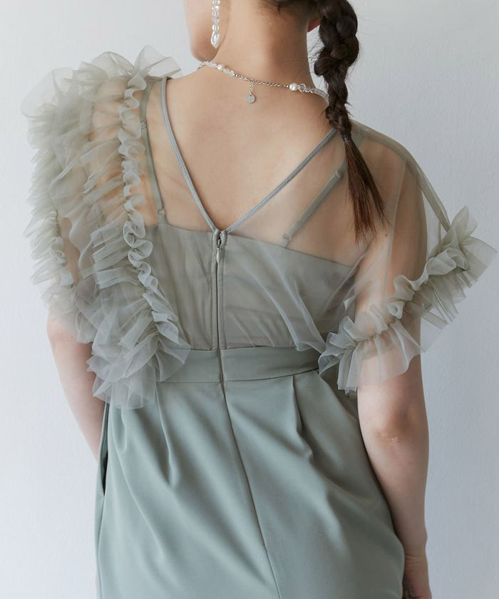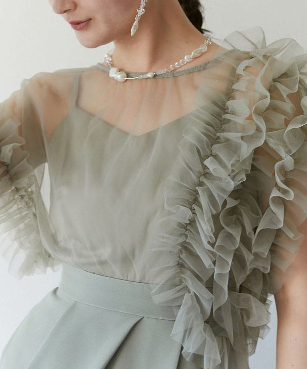チュールにたっぷりとギャザーを寄せ、左右アシンメトリーにフリルを施したデザインが華やかなオケージョンドレス。