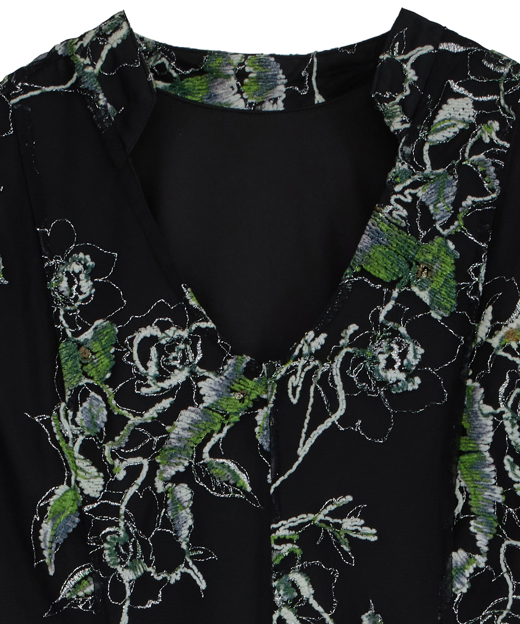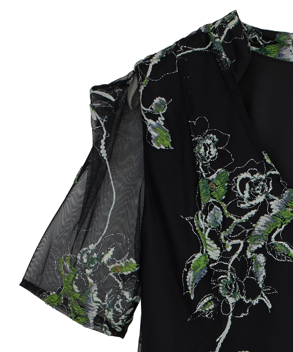 花柄プリントを施したドレスで、袖があるため、幅広い季節にご着用いただけます。開き過ぎないバックオープンデザインで、上品な抜け感があります。また前後着用可能で、ハイネックとVネックで異なる雰囲気でご着用いただけます。またウエストマークされておりスタイルアップ効果があります。左脇のファスナーより着脱可能です。ストレッチのある素材を使用しているため、ストレスフリーでご着用いただけます。