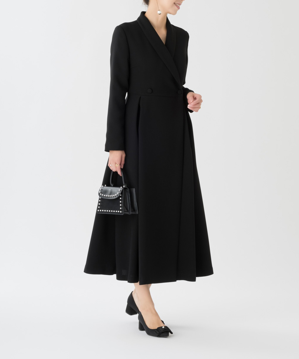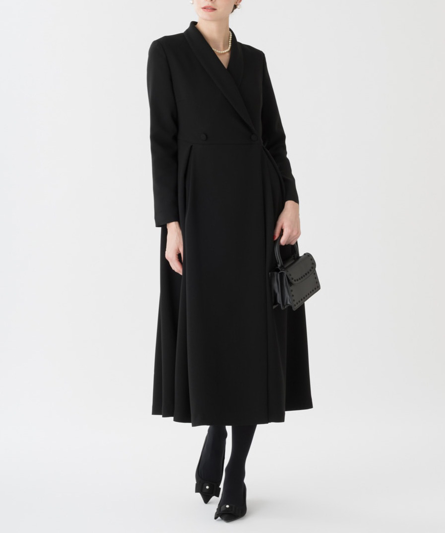 上質なブラックフォーマル素材を使用し、ショールカラーやラップデザイン、ロング丈などクラシカルな要素を取り入れたワンピースは、光沢のない漆黒色で様々なシーンに対応できるようデザインされています。美しいシルエットや裾が広がらない内ボタン、シワになりにくいダブルクロス素材など所作にも配慮され、アクセサリー次第でフォーマルから他の場面にも合わせられる一着です。
