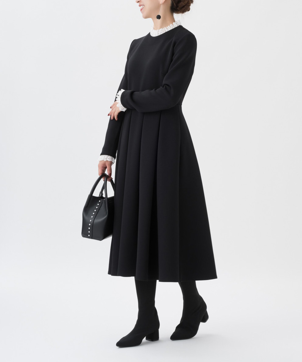襟と袖に施されたレース使いがクラシカルで上品な華やかさを演出します。伸縮性があり快適な着心地のコンパクトな身頃や、シワになりにくいもっちりとした肉厚な生地が特徴です。