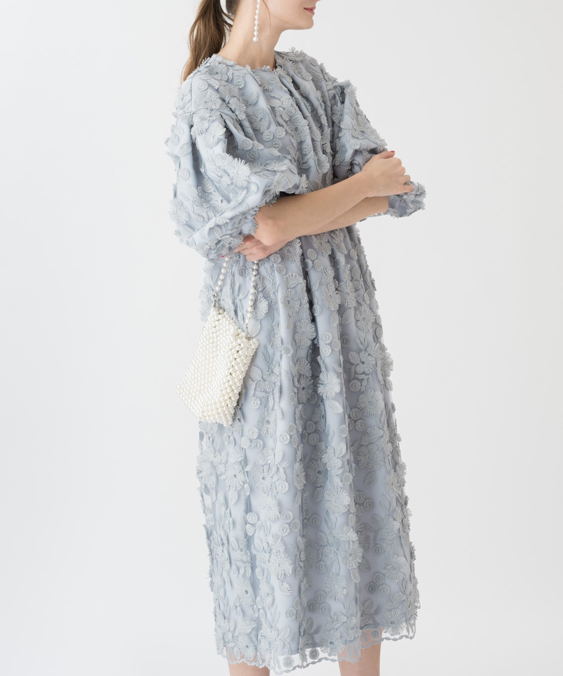 トルコ製レースを贅沢に使用した主役ワンピースは、一枚で上品で華やかな印象を与えます。裾はスカラップで揺れ動く刺繍が魅力的で、ウエストの切り替え位置が高いためバランスの良いシルエットになっており、袖口はゴム仕様でブラウジングを行い、シーズンに合わせた袖丈の調節が可能です。