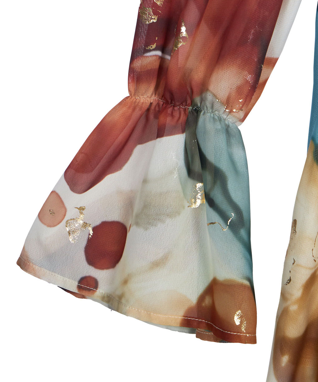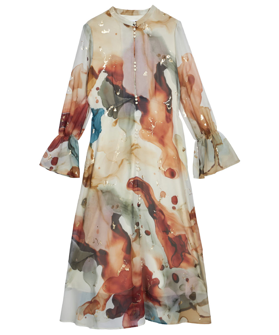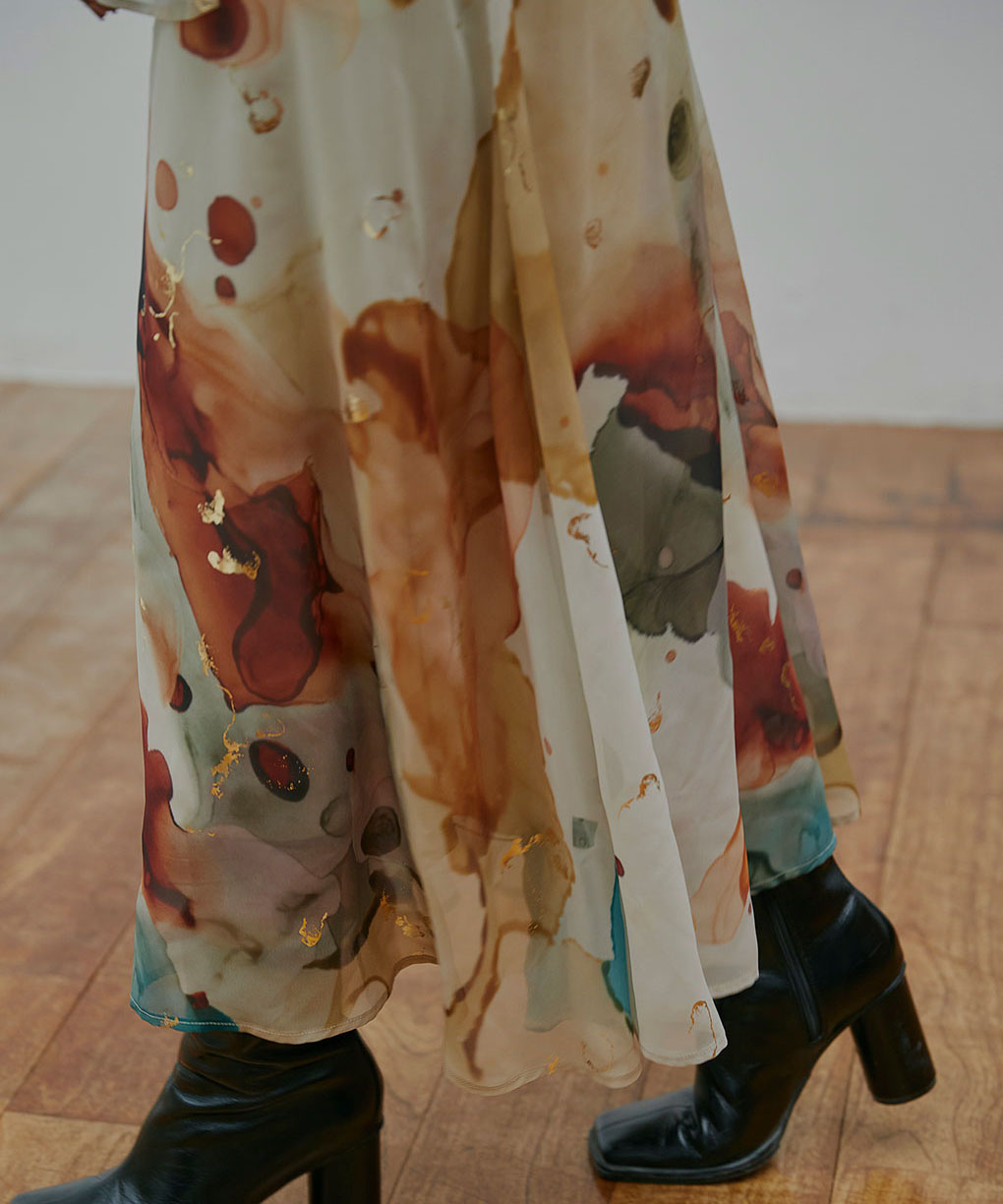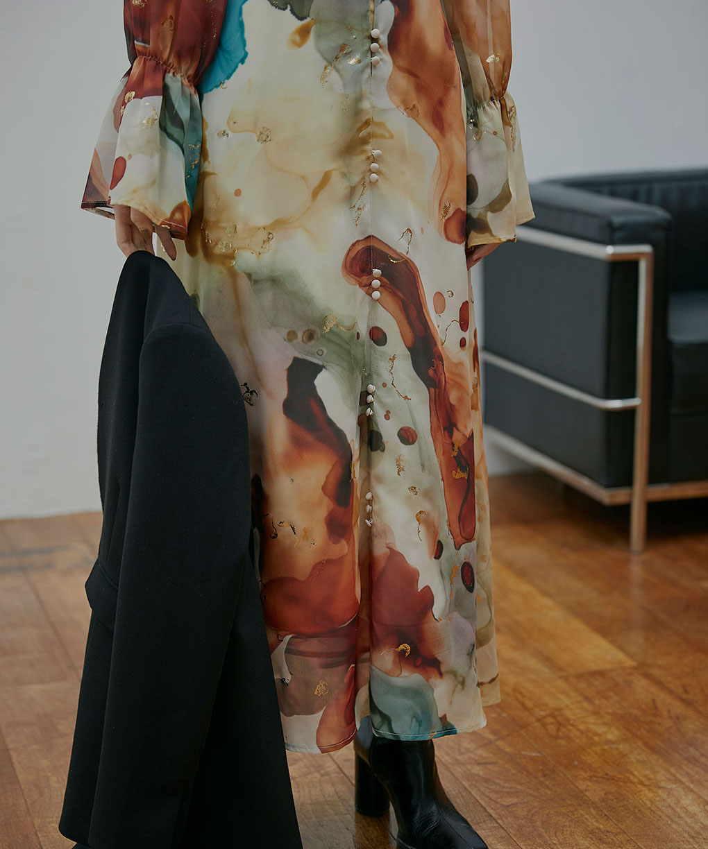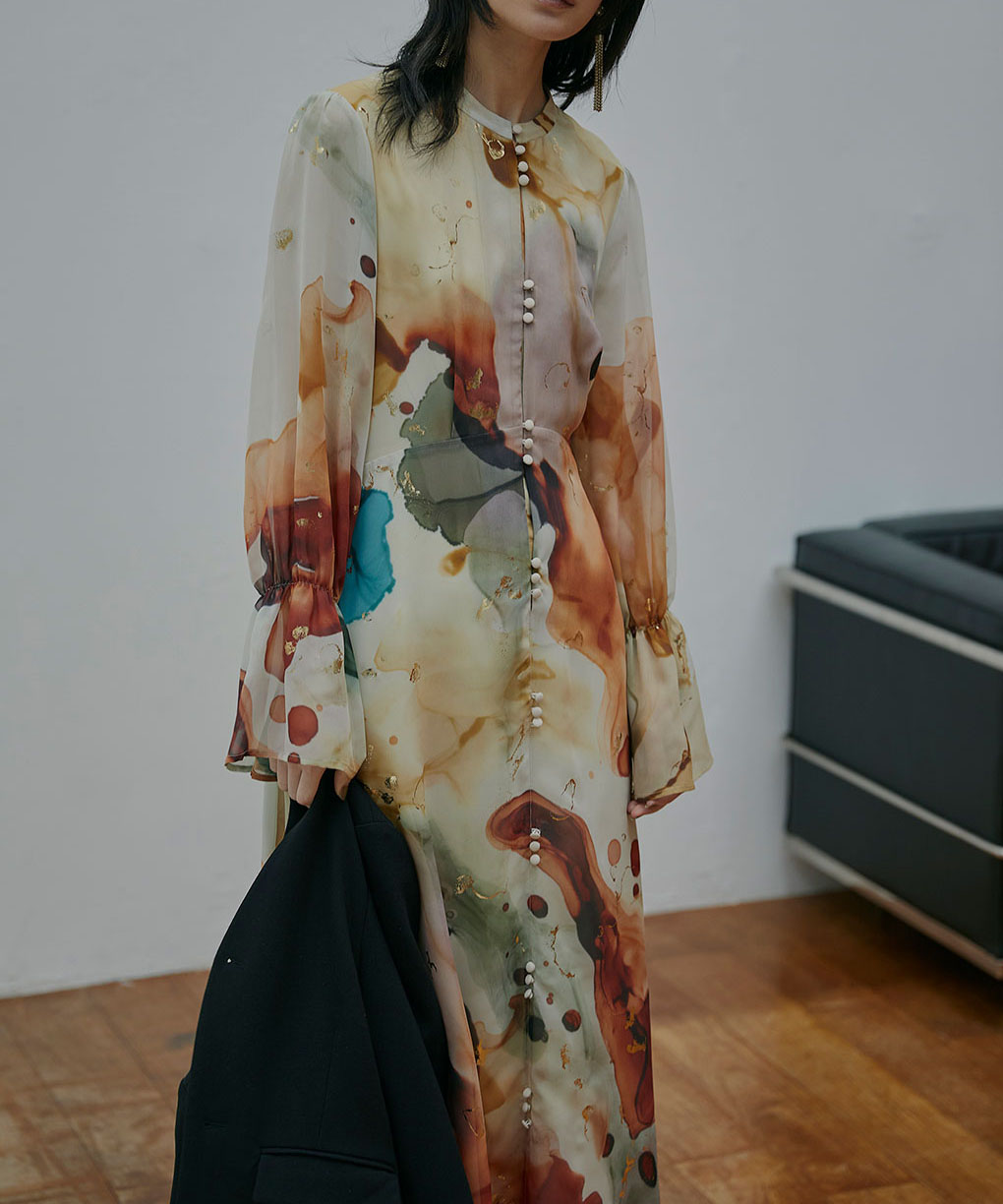 Ameriの人気ドレスが復刻。アルコールインクアート柄のワンピースでデザイン性が高く、金の箔プリントが華やかな印象のドレスです。ウエストのラインを変更することも可能なため、骨格タイプに関わらずご着用いただけます。商品特性上、目立たない糸つれがある場合がございます。予めご了承ください。