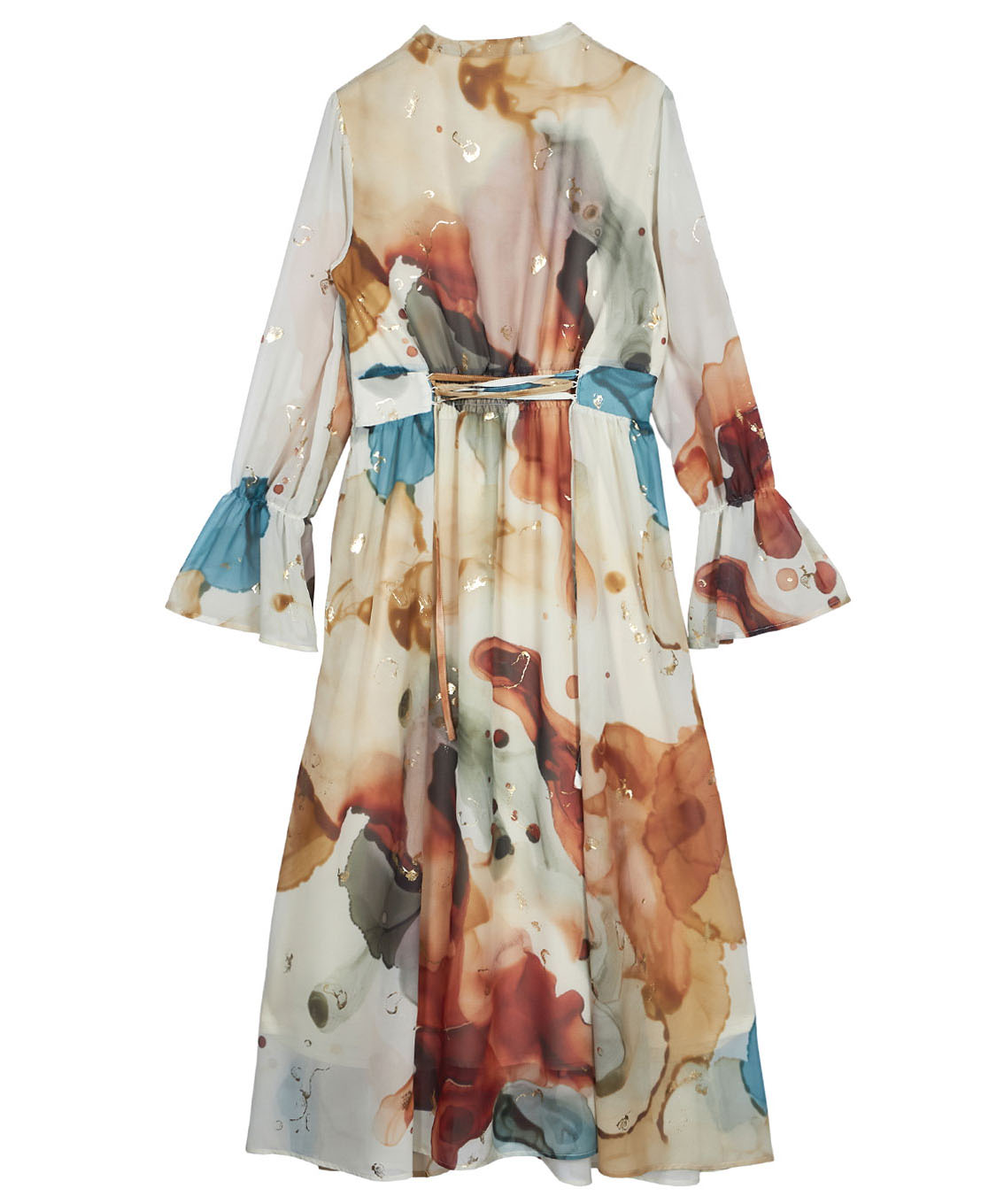Ameriの人気ドレスが復刻。アルコールインクアート柄のワンピースでデザイン性が高く、金の箔プリントが華やかな印象のドレスです。ウエストのラインを変更することも可能なため、骨格タイプに関わらずご着用いただけます。商品特性上、目立たない糸つれがある場合がございます。予めご了承ください。