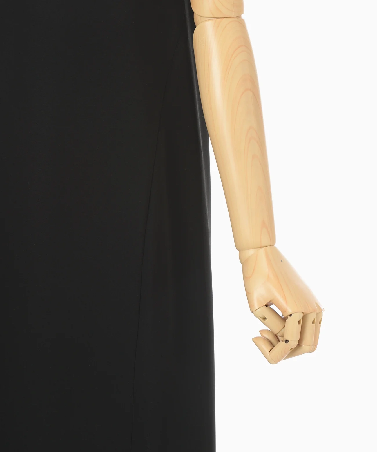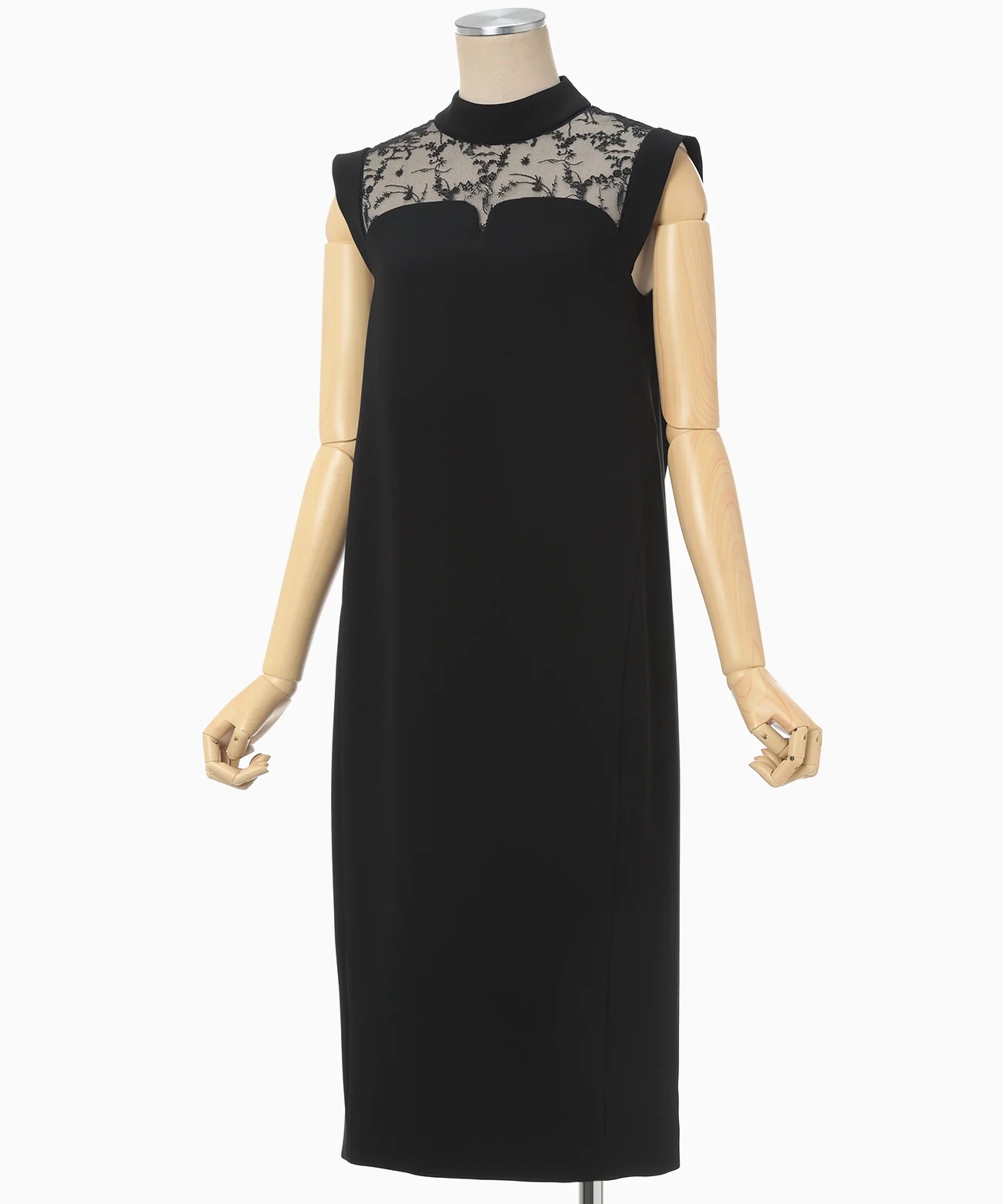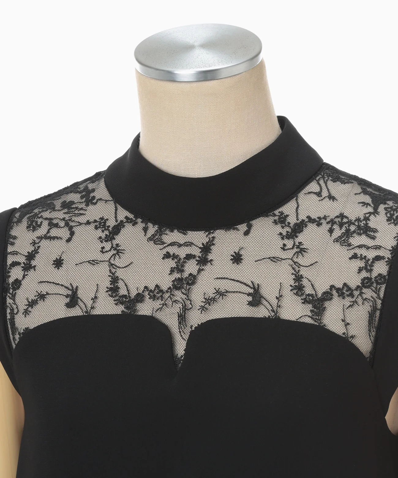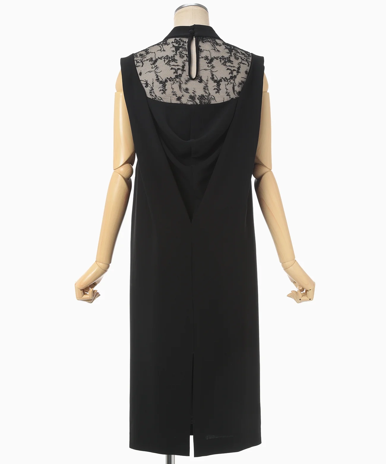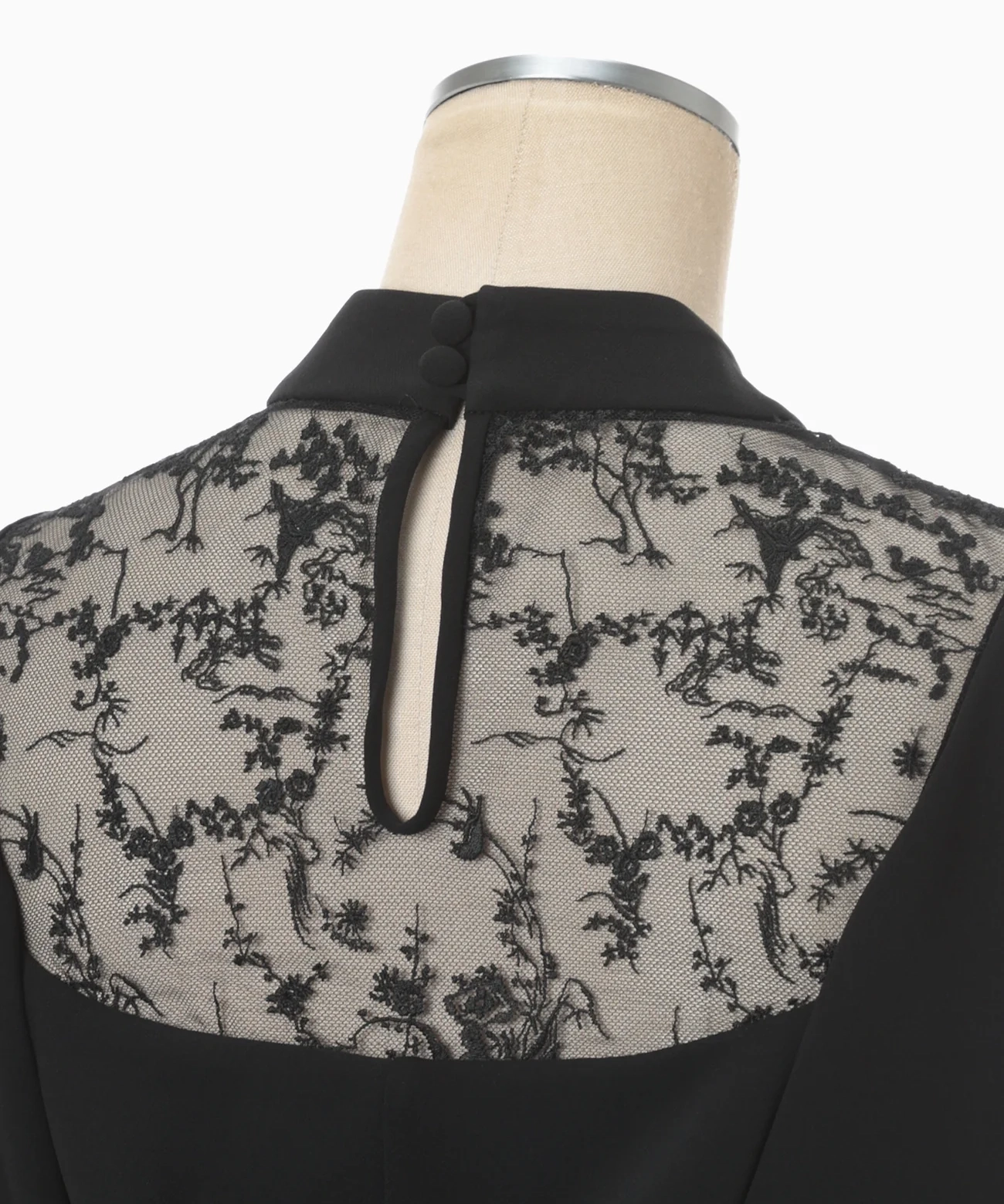 チュールレースの繊細な柄がエレガントな印象を与え、背中のドレープやデコルテ部分のレースがセンシュアルなアクセントを加えています。細やかな柄とディテールが立体感と気品を漂わせ、洗練された着こなしが楽しめる一着です。