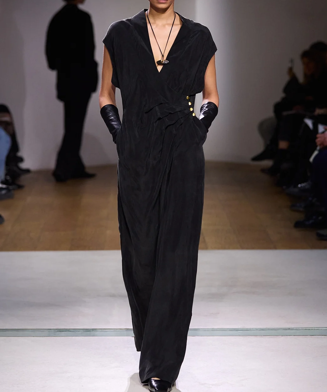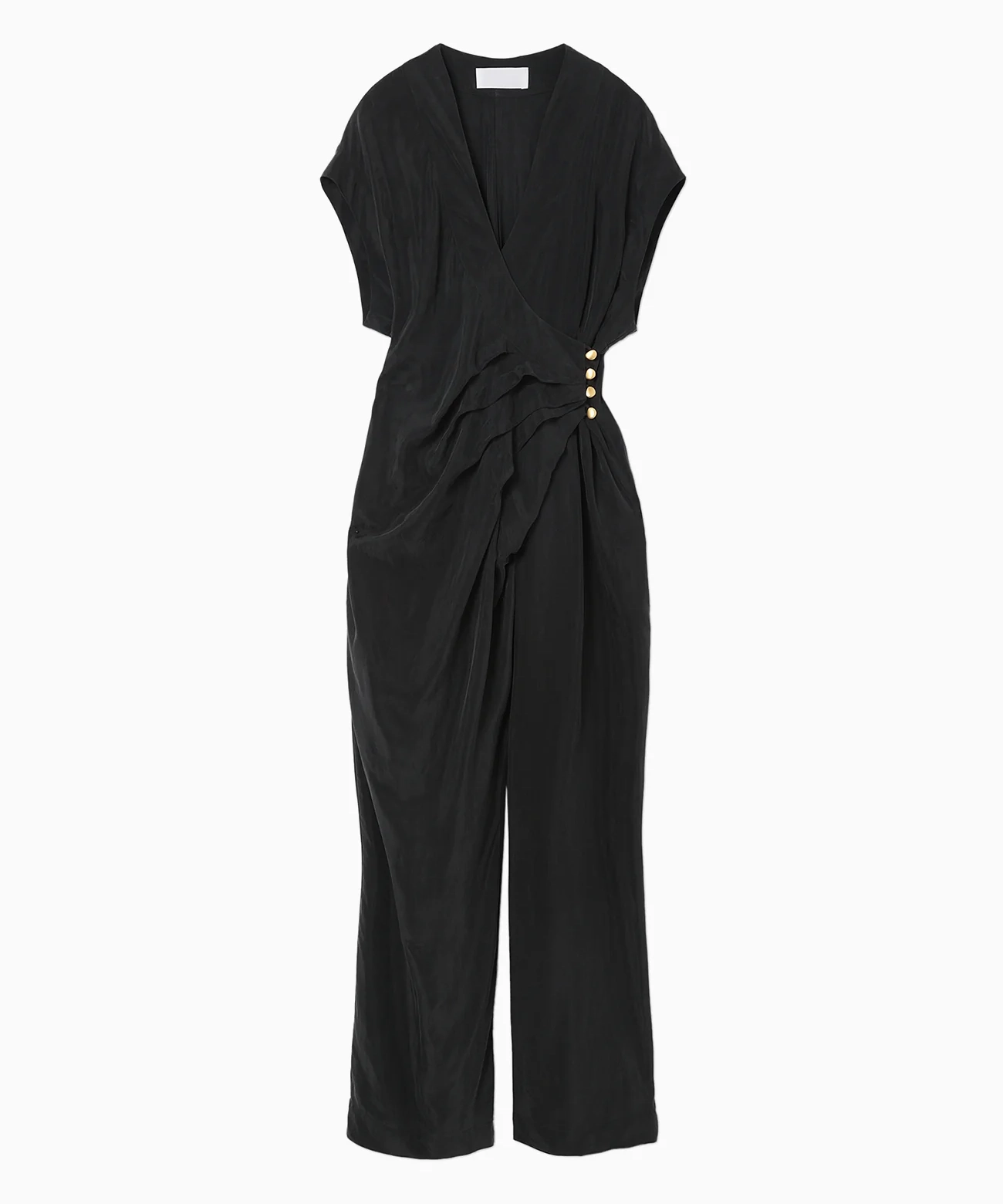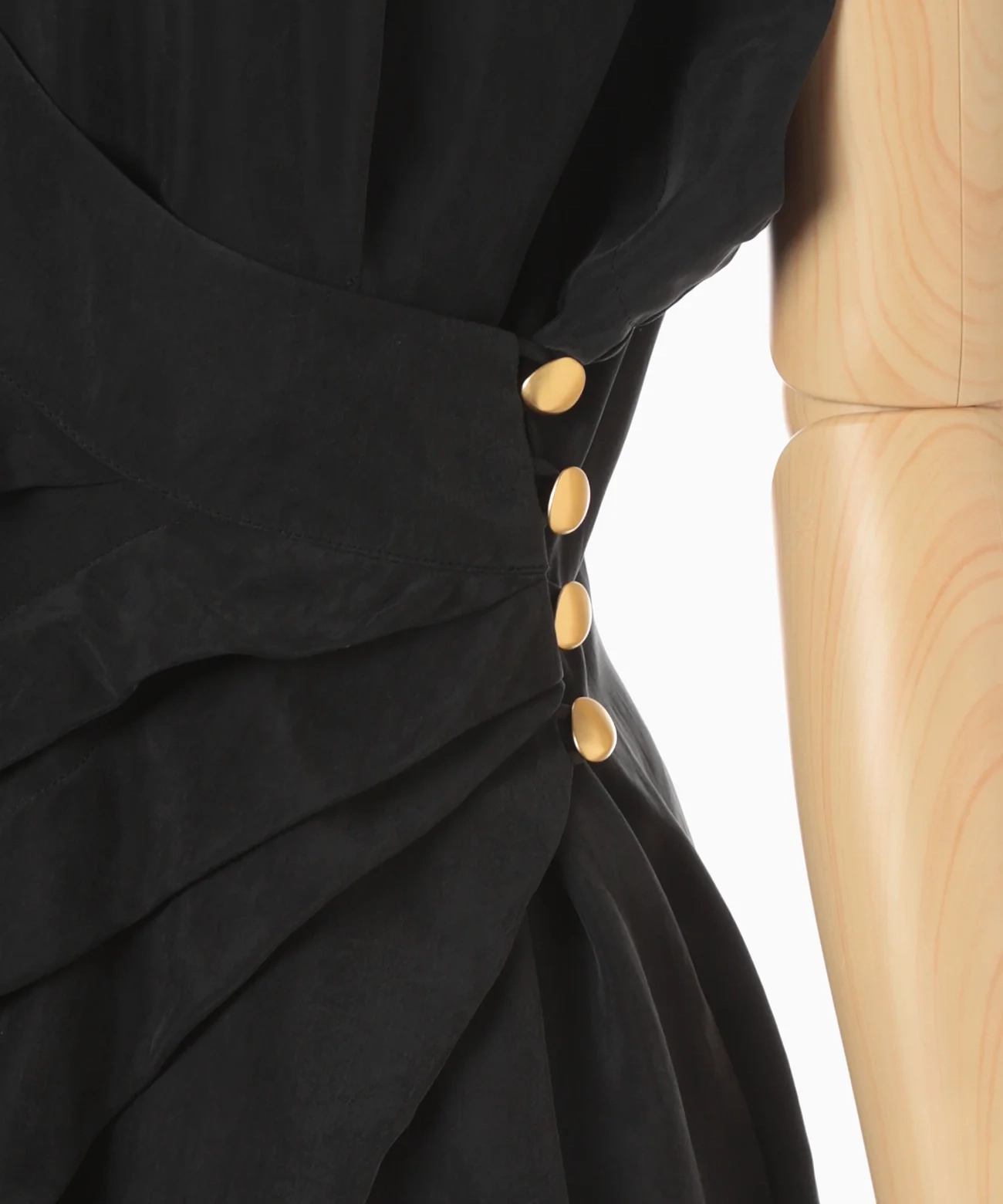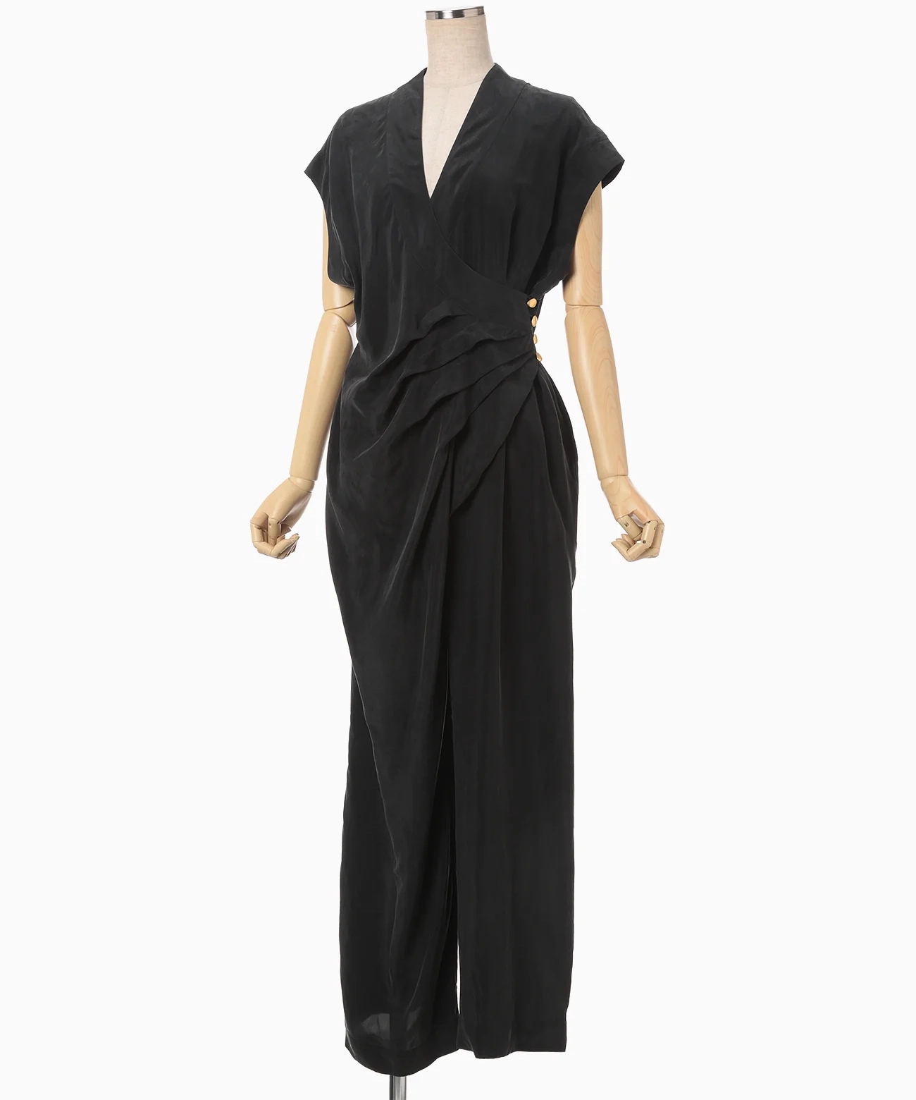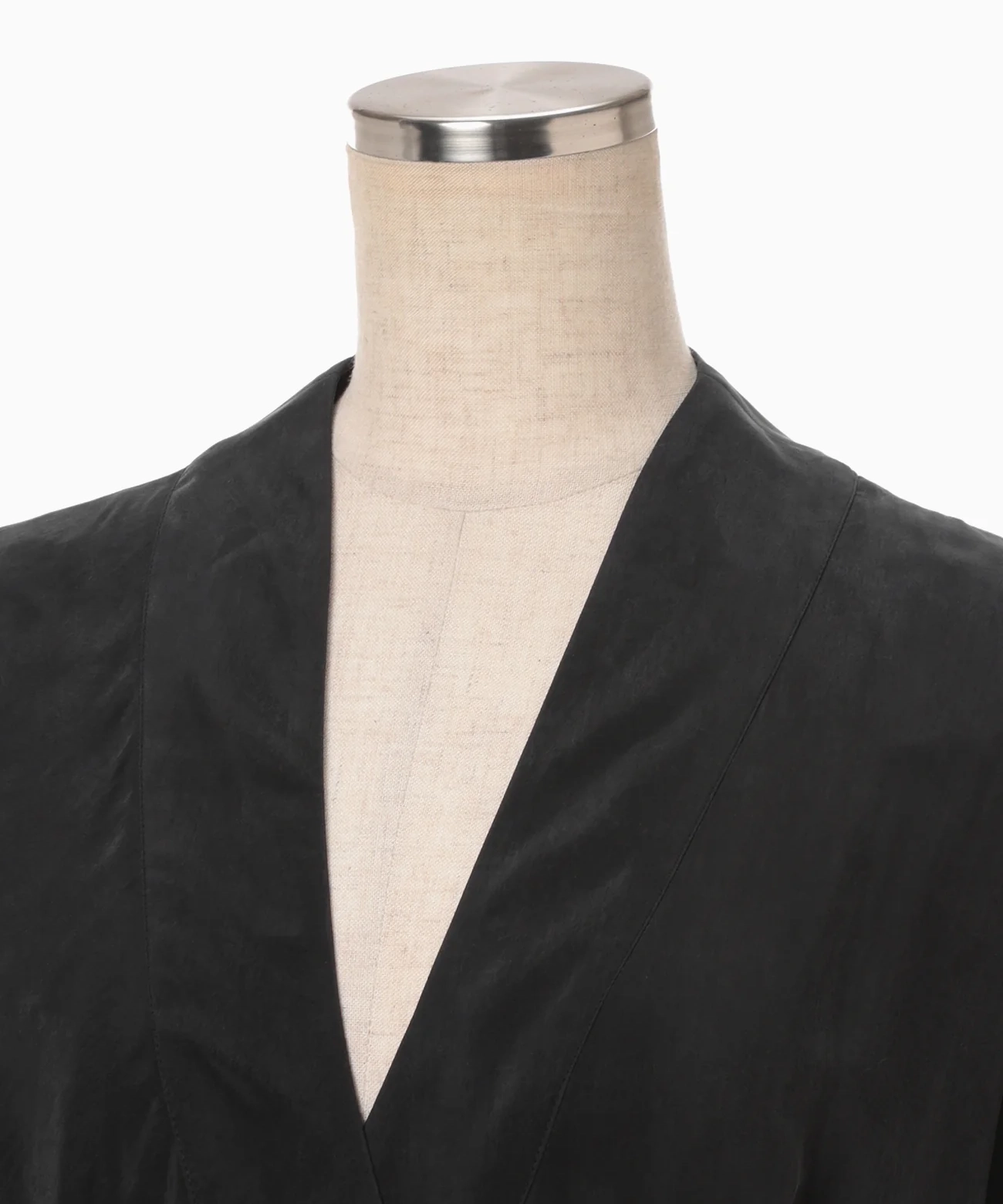 ウエストに配したタックから流れるようなドレープと大きく開いた襟ぐりや袖が、リラクシングなムードを演出しながら上品さもプラス。様々なインナーを合わせることで、オケージョンからカジュアルなシーンまで幅広く活躍する一着です。