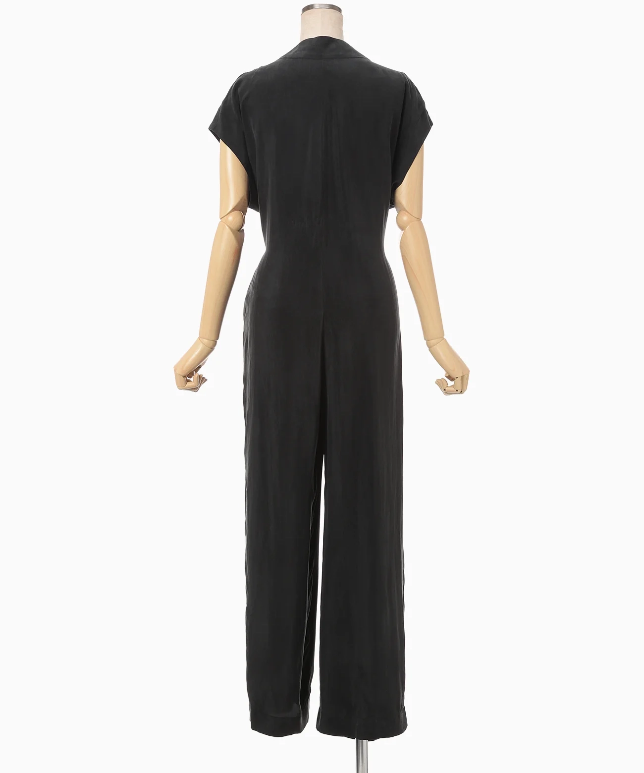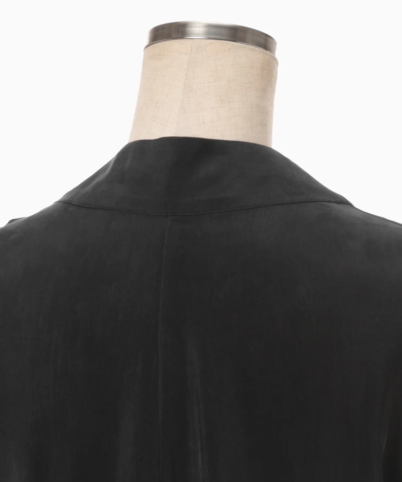 とろみのある滑らかな風合いが特徴的なジャンプスーツです。経糸と緯糸に太番手のキュプラ糸を使用し、ドレープ感の中に張りを残した平織り生地にフィブリル加工を施し、繊維を毛羽立たせることでヴィンテージ感のある表情と滑らかな肌触りを実現しています。