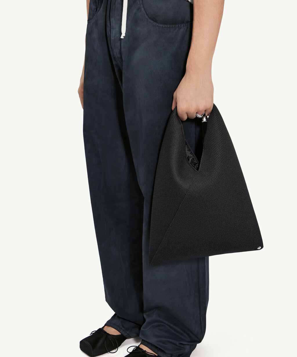 日本の伝統的な折り紙にインスパイアされた三角形のフォルムが特徴のバッグは、形を変えることができるスナップボタンを備えており、メゾンの脱構築的なデザインコードを反映しています。