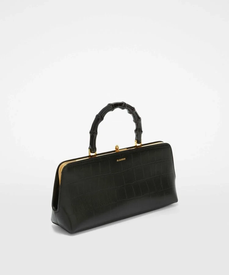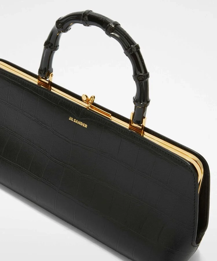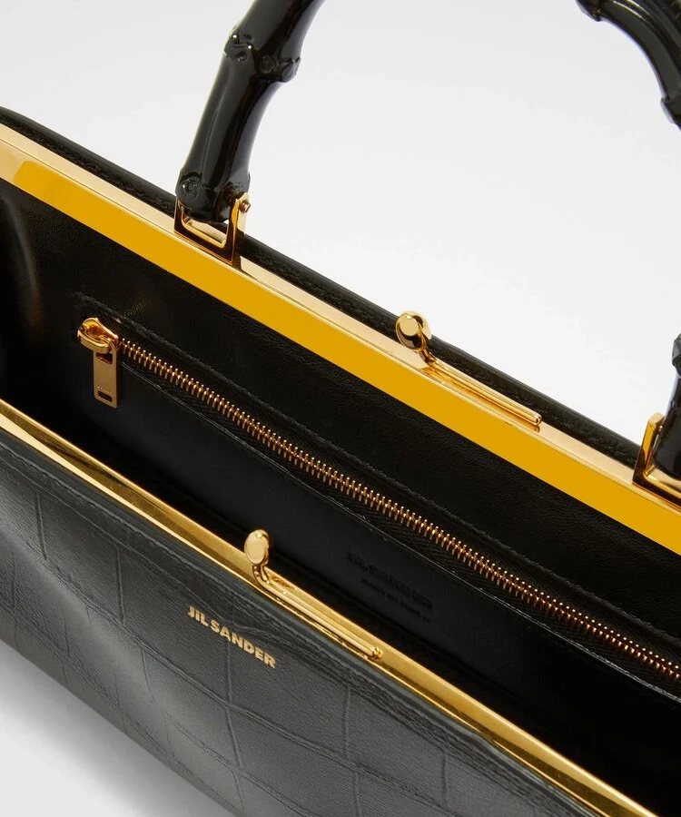 メタルフレームのディテールとJil Sanderロゴのエンボス加工が施されたスモールサイズのレザーハンドバッグです。洗練されたデザインで、スタイリッシュなアクセントを加えます。