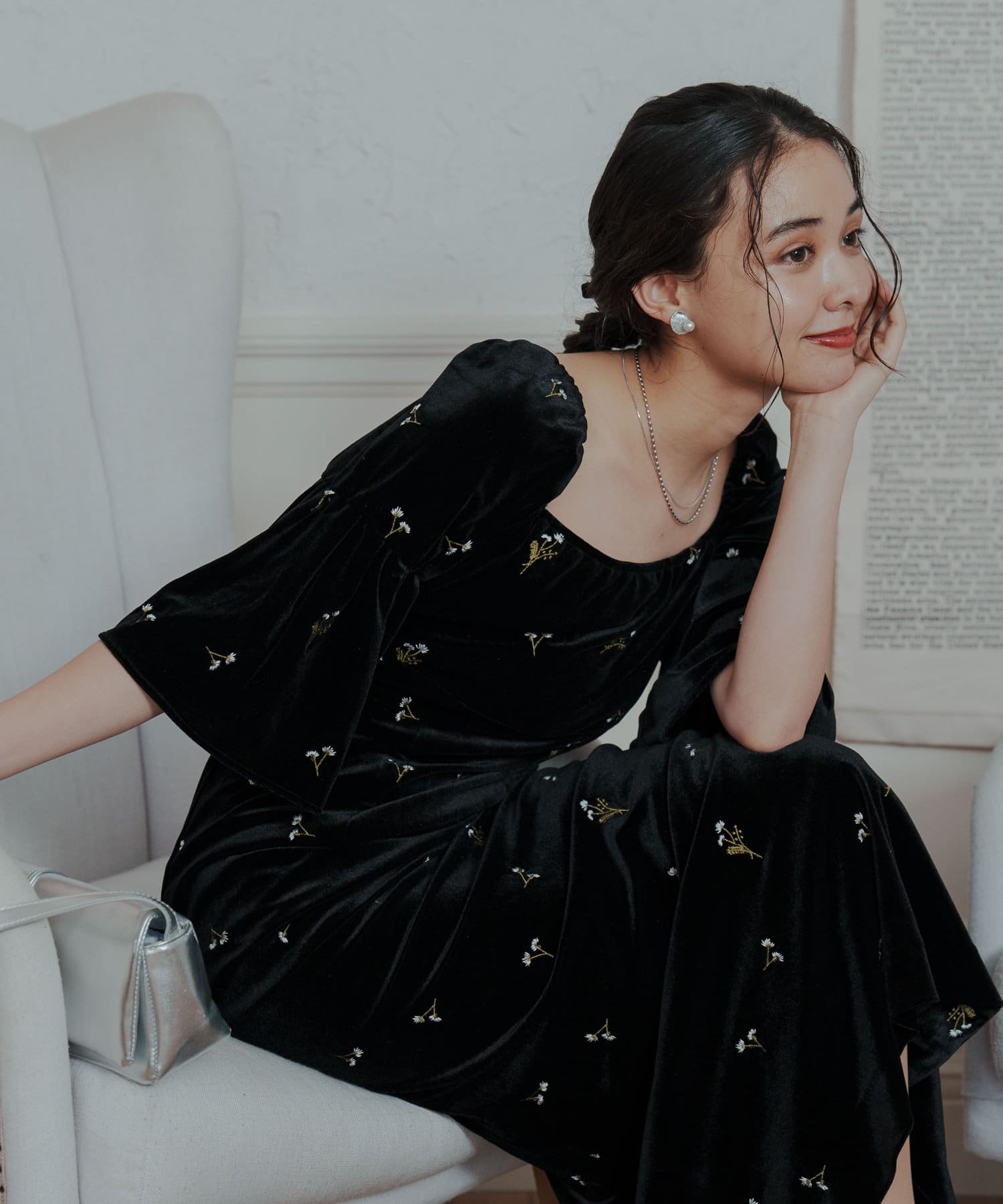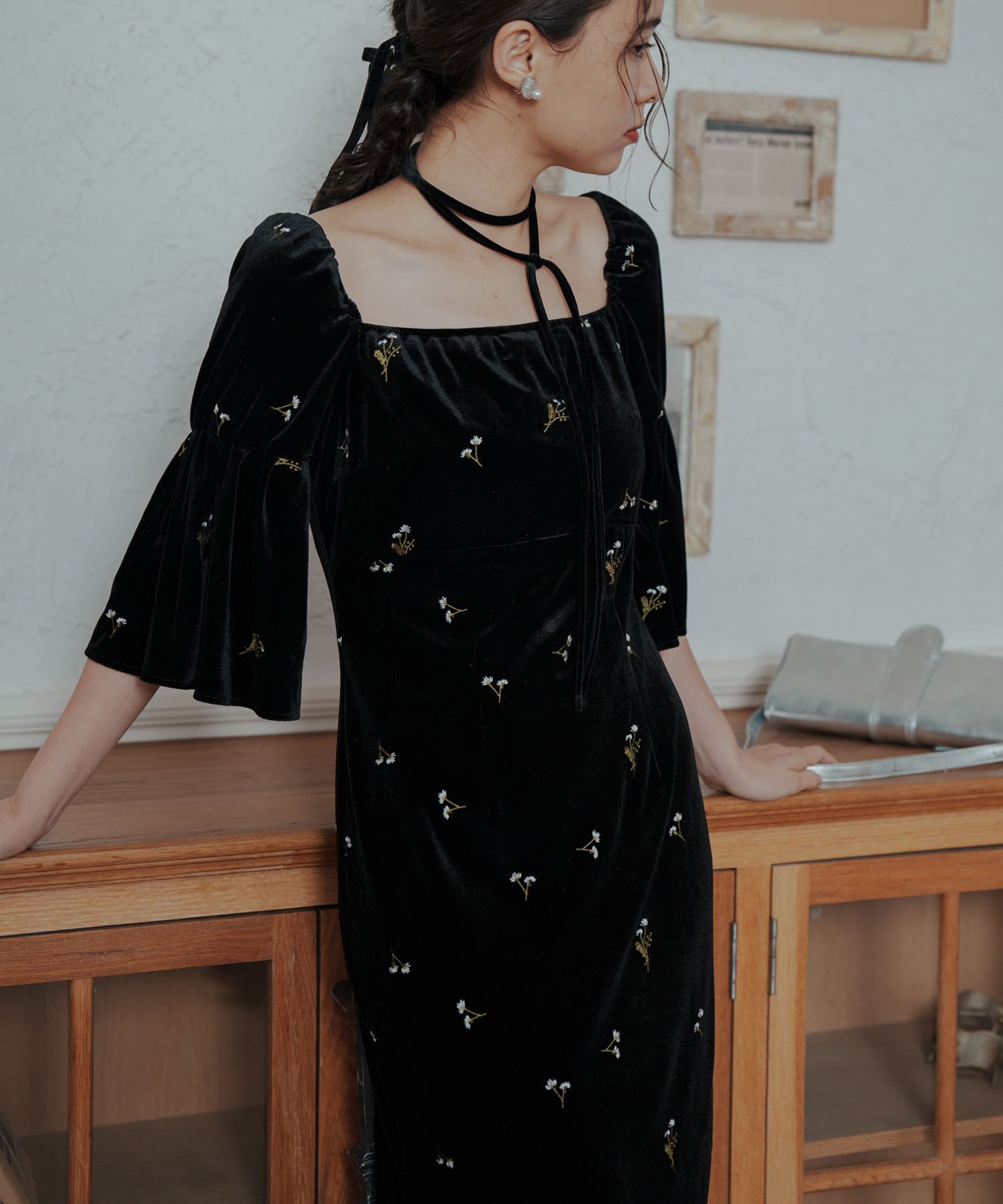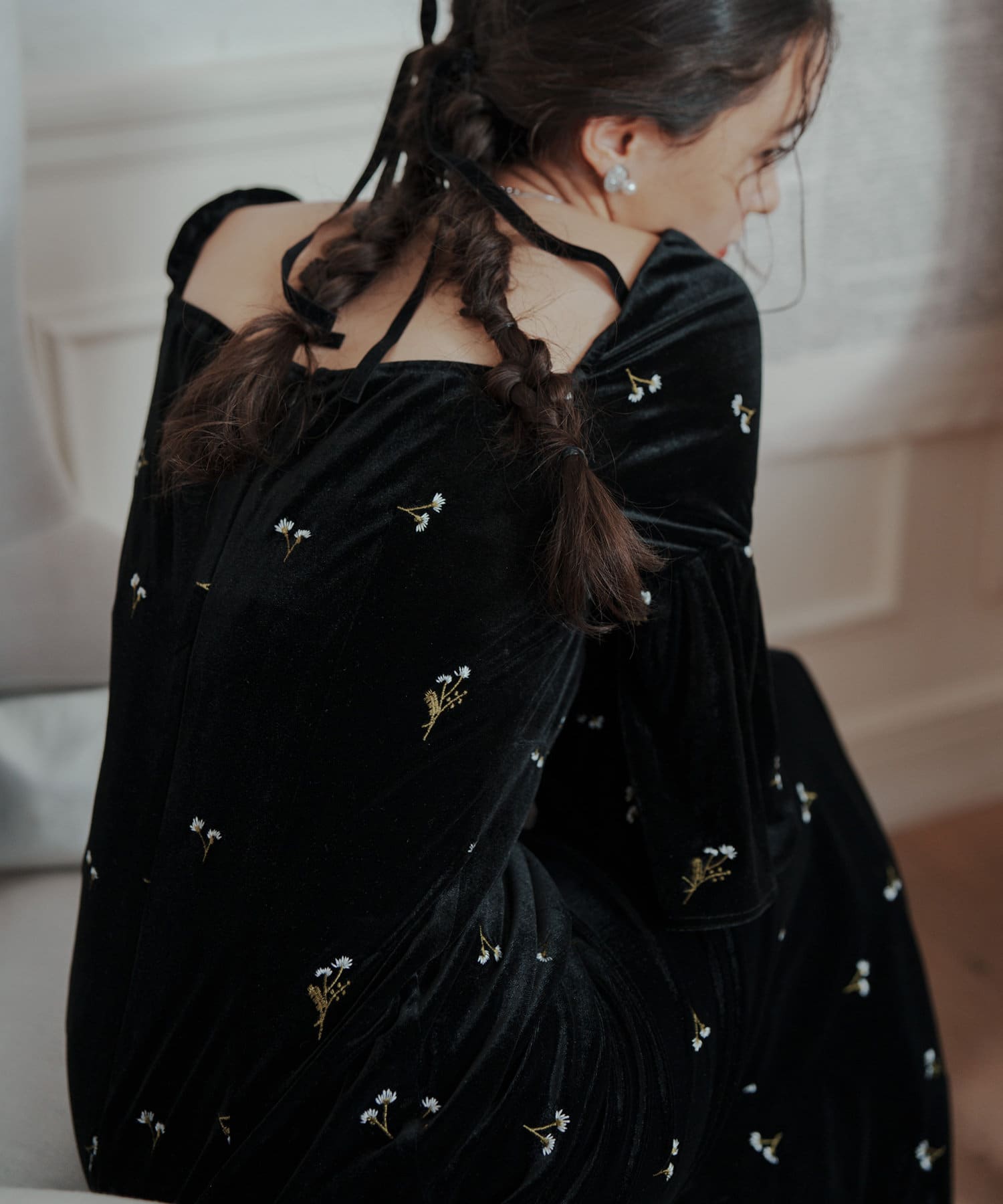 柔らかな光沢感と深みのあるベルベット生地に小花柄の刺繍が施された上品なロングドレスです。ベルスリーブが動くたびに柔らかく揺れ、二の腕をさりげなくカバーしてくれるのも嬉しいポイント。セットのベロア紐は、胸元のループに通してホルターネック風にしたり、チョーカーや腰のアクセントとしても使えるため、シーンに応じたアレンジが楽しめます。