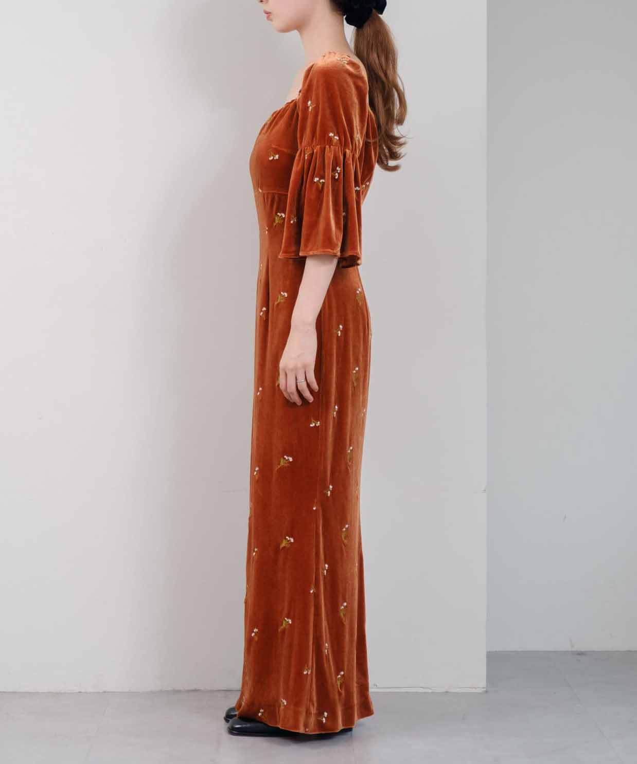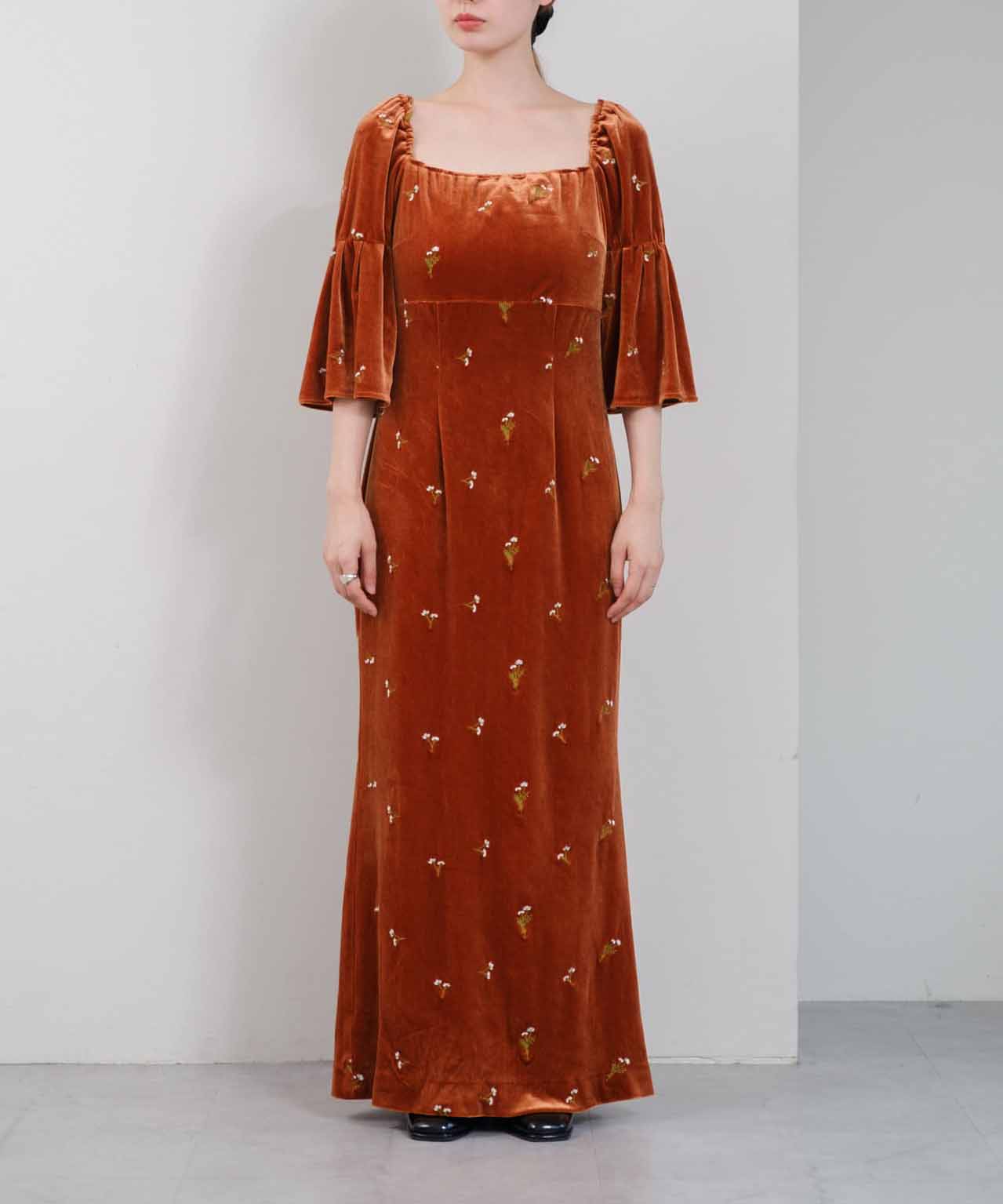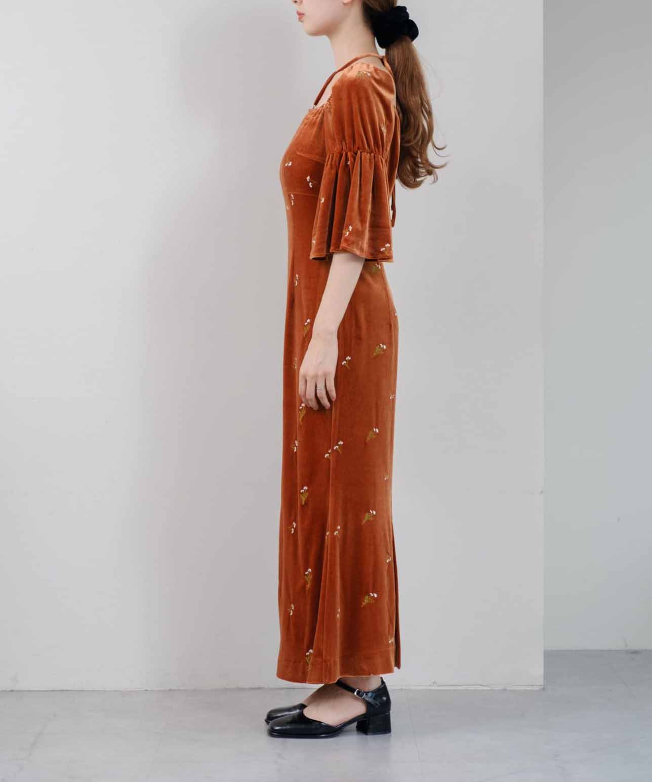 柔らかな光沢感と深みのあるベルベット生地に小花柄の刺繍が施された上品なロングドレスです。ベルスリーブが動くたびに柔らかく揺れ、二の腕をさりげなくカバーしてくれるのも嬉しいポイント。セットのベロア紐は、胸元のループに通してホルターネック風にしたり、チョーカーや腰のアクセントとしても使えるため、シーンに応じたアレンジが楽しめます。