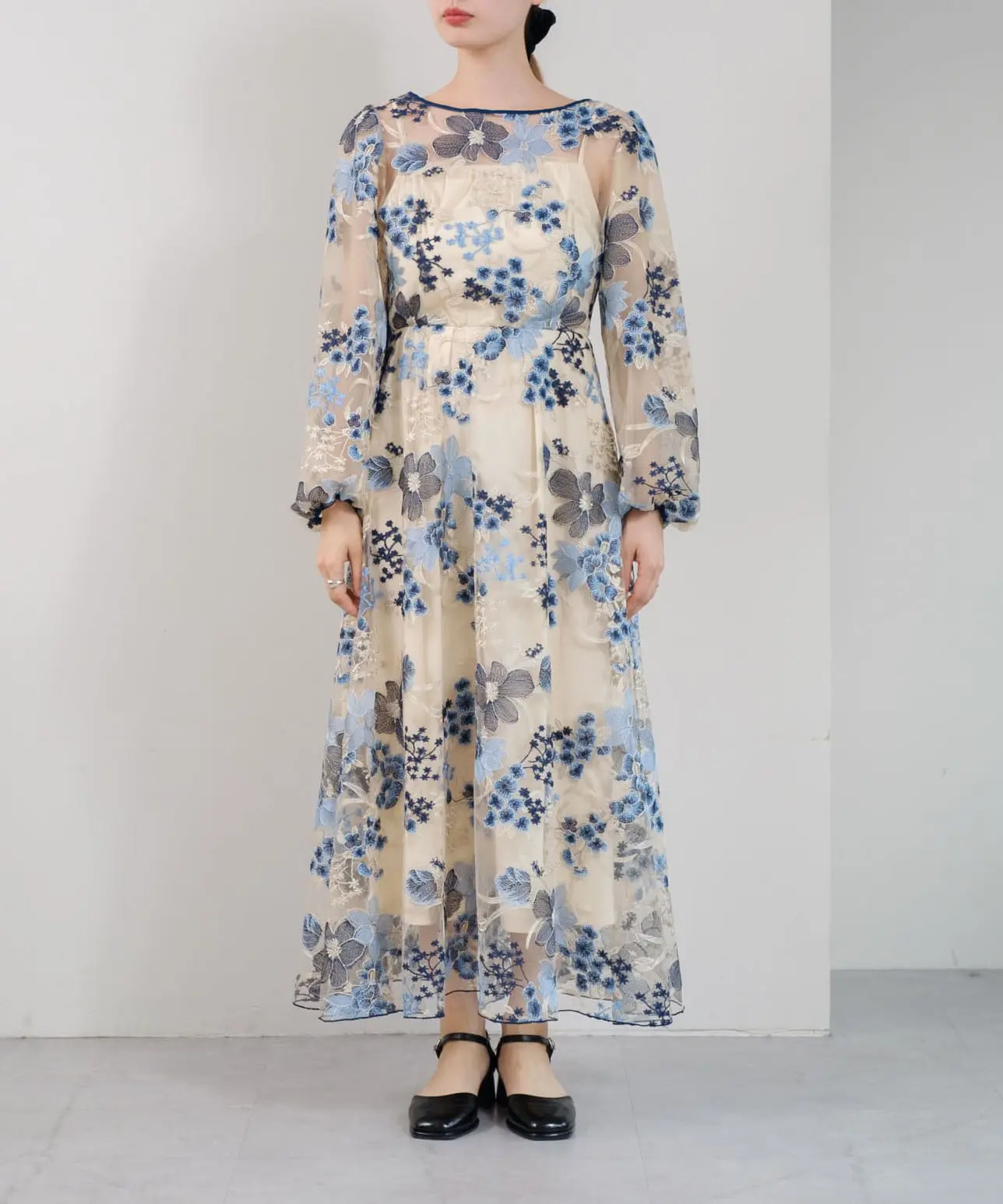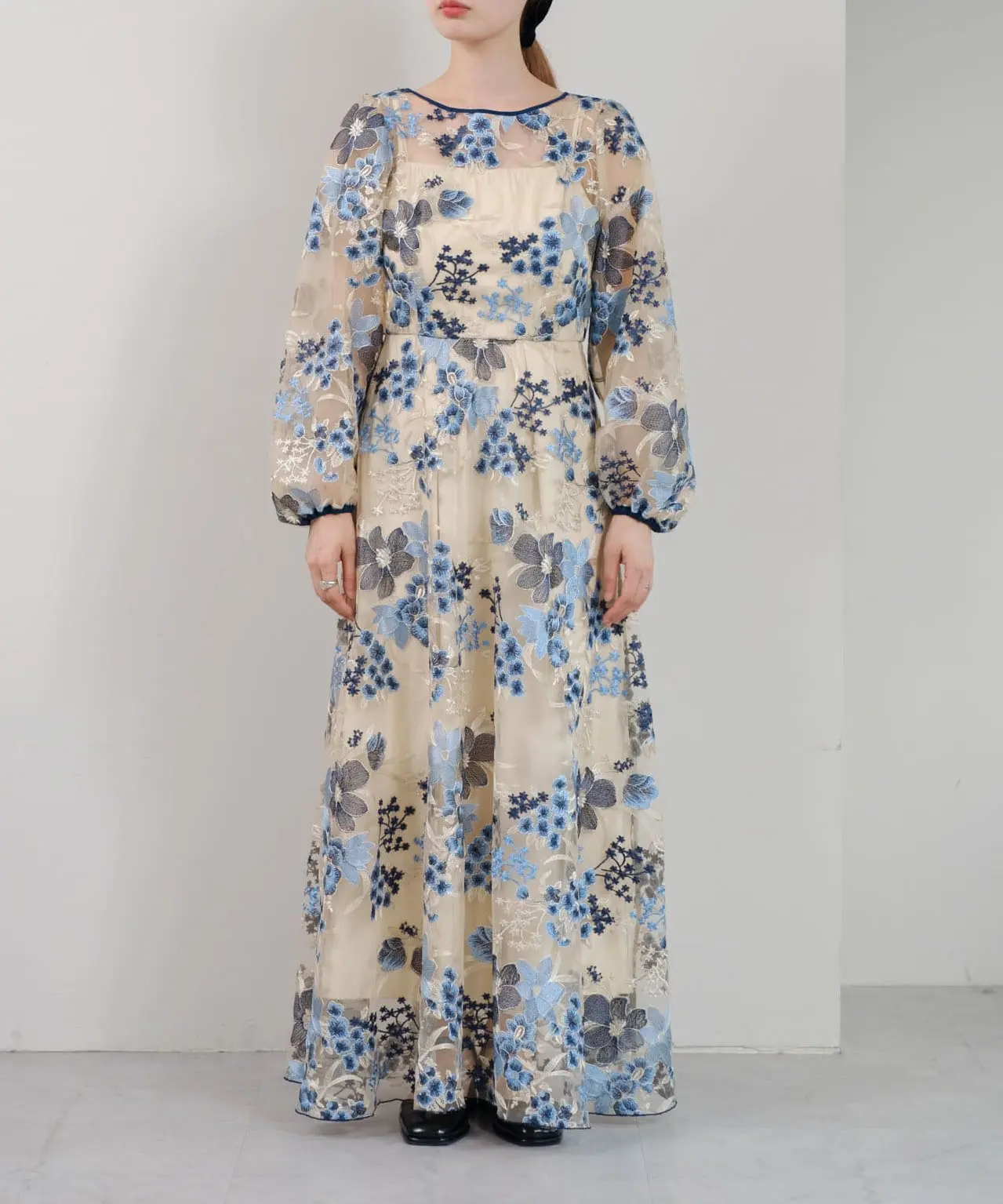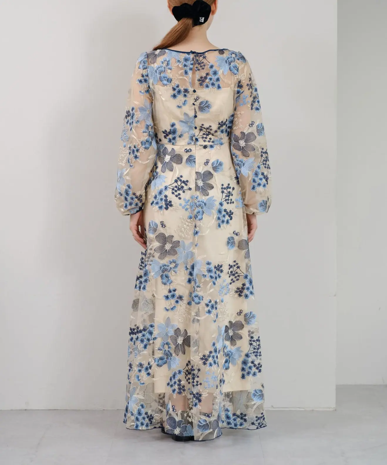 オーガンジー素材特有の軽やかで上品な透け感が、エレガントさを際立たせる一着です。THE URBAN BLANCHEのウェディングドレスのディティールを取り入れ、美しいシルエットを実現しているため、品格のあるスタイルがお好きな方には非常におすすめです。精巧な花柄刺繍が施されており、動きに合わせて光を受けて美しい陰影が生まれ、見る角度ごとに異なる表情が楽しめます。また、ウエストのギャザーが自然に体に沿い、Aラインシルエットがエレガントな雰囲気を強調します。厳選されたシーンにふさわしい、洗練された印象を与える一着です。