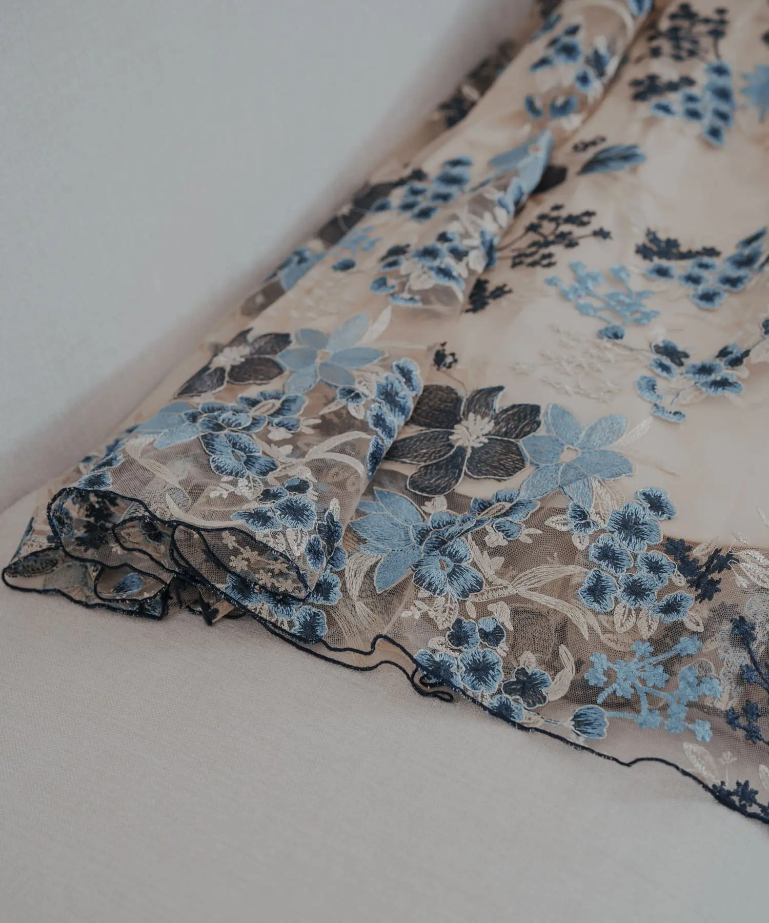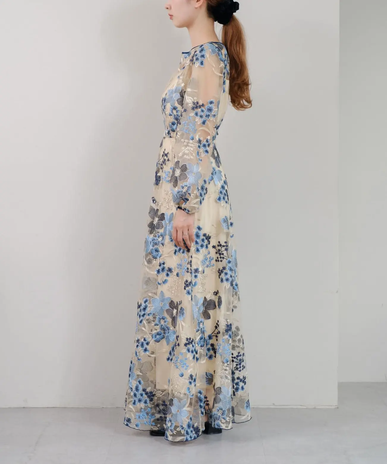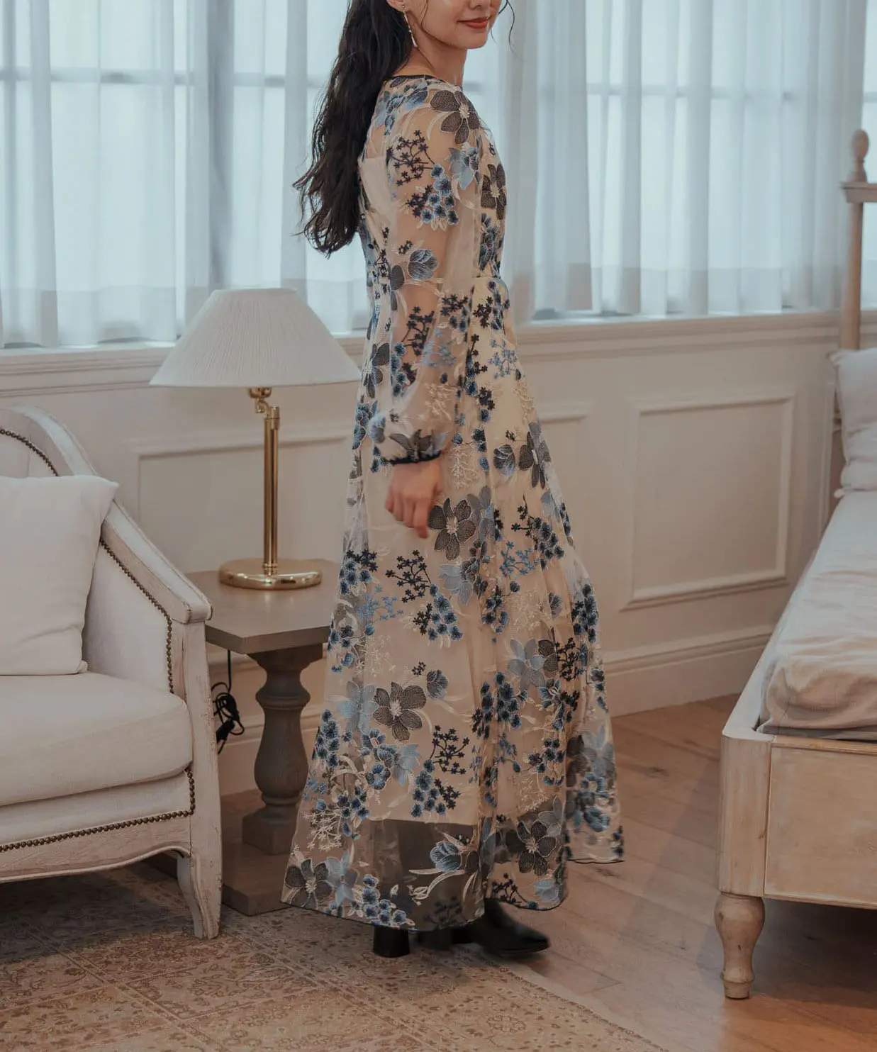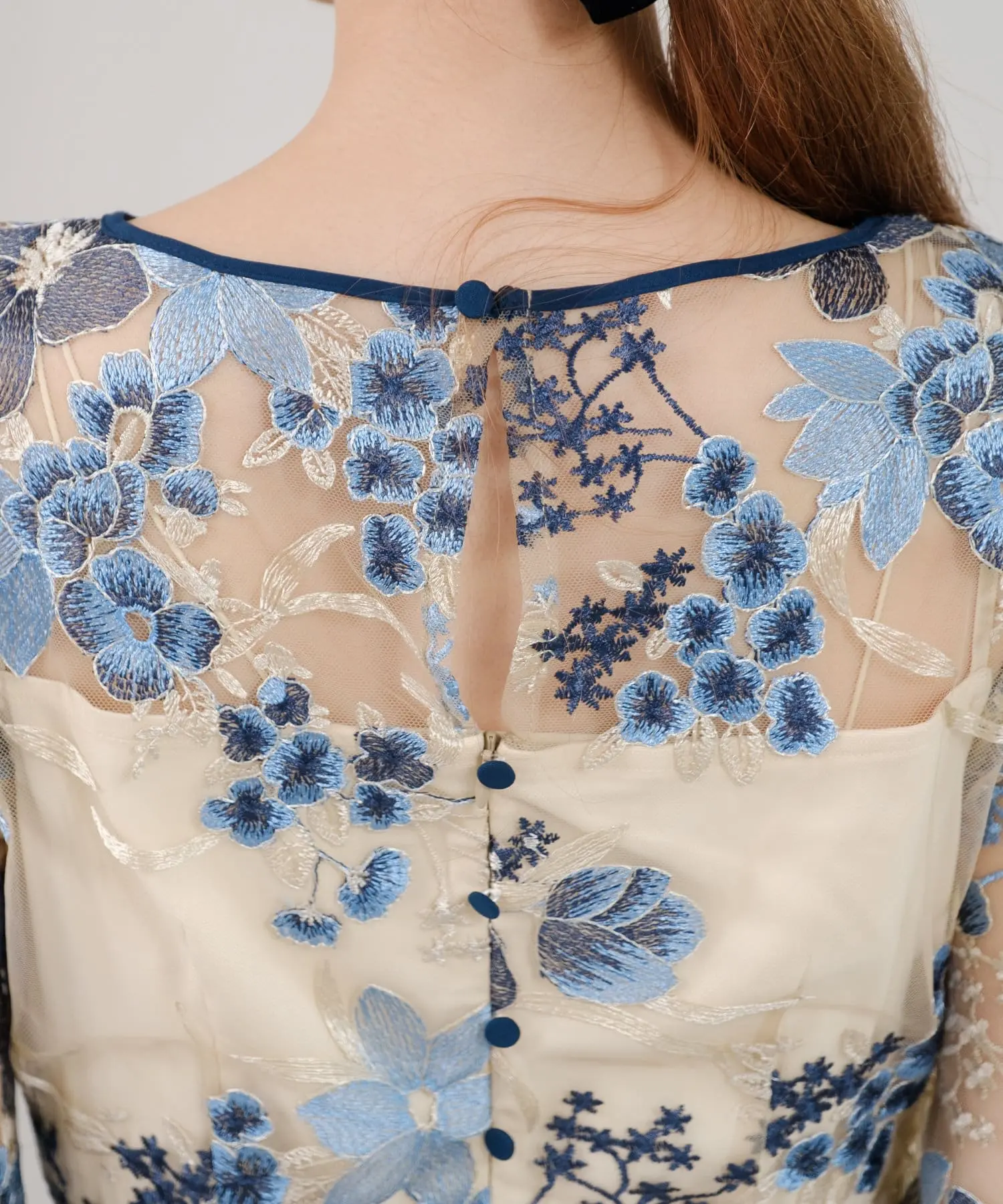 オーガンジー素材特有の軽やかで上品な透け感が、エレガントさを際立たせる一着です。THE URBAN BLANCHEのウェディングドレスのディティールを取り入れ、美しいシルエットを実現しているため、品格のあるスタイルがお好きな方には非常におすすめです。精巧な花柄刺繍が施されており、動きに合わせて光を受けて美しい陰影が生まれ、見る角度ごとに異なる表情が楽しめます。また、ウエストのギャザーが自然に体に沿い、Aラインシルエットがエレガントな雰囲気を強調します。厳選されたシーンにふさわしい、洗練された印象を与える一着です。