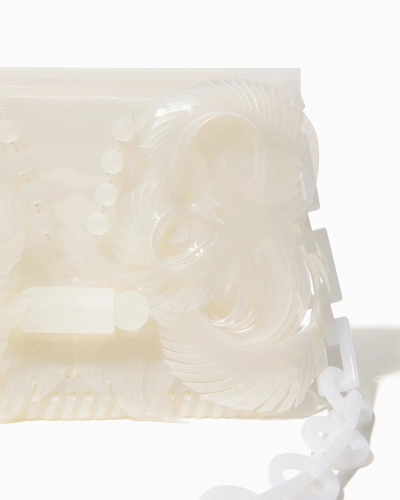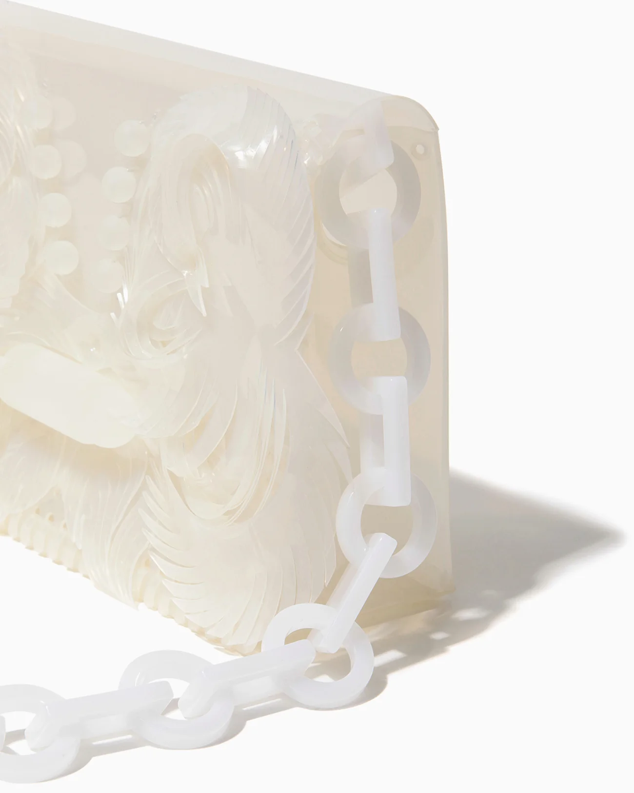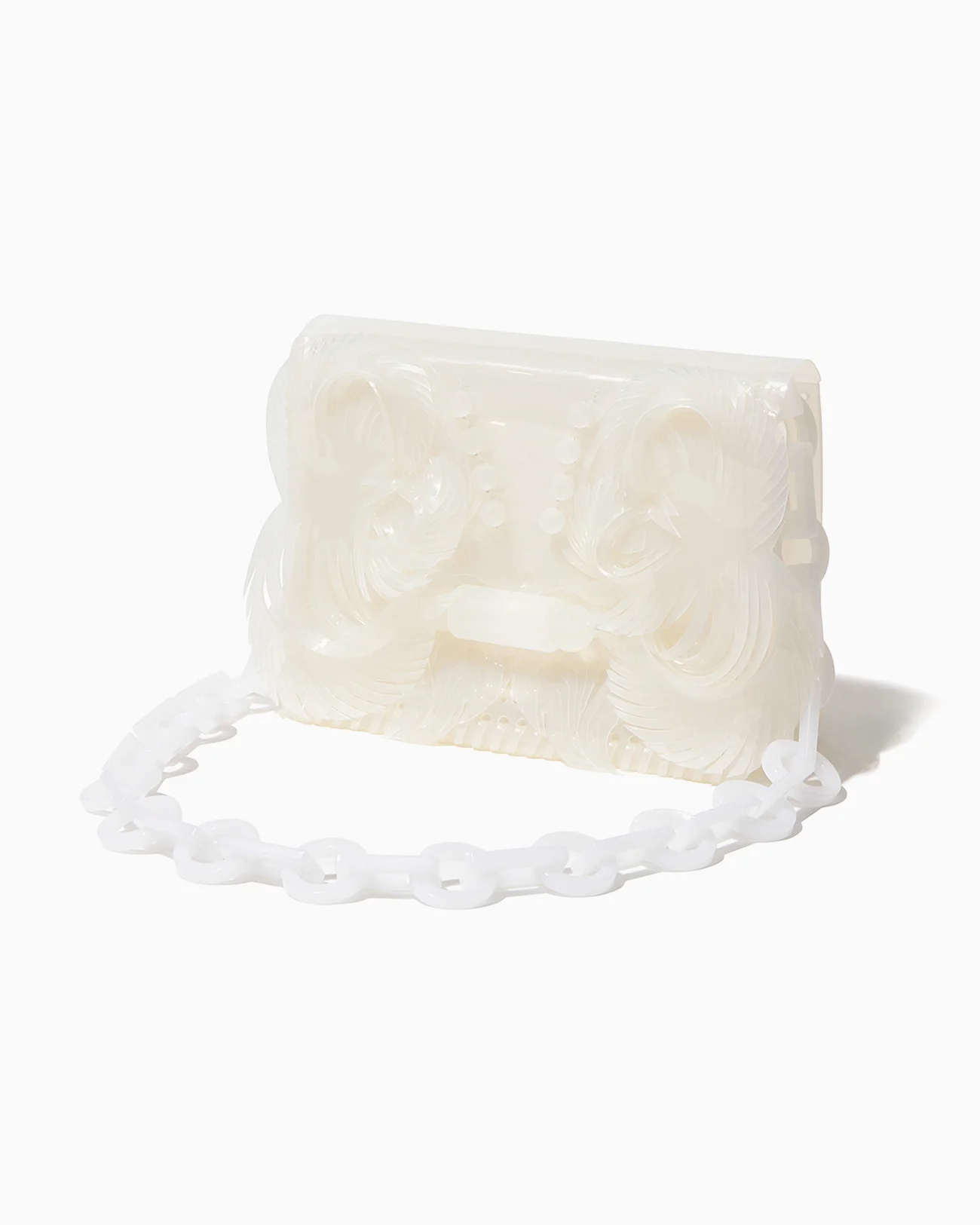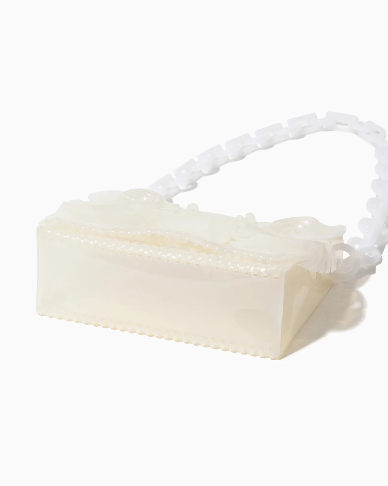 PVC素材の美しさを引き出し、Mame Kurogouchiのシグネチャーシリーズとして人気を集めています。デザイナーが幼少期の冬景色を重ねてデザインしたこのバッグは、裁断から組み立てまで職人の手作業によって作られており、ガラスのような繊細な輝きと氷柱を思わせる立体モチーフが特徴です。オリジナルのチェーン付きで斜めがけも可能なので、さまざまなシーンで華やかなアクセントとして活躍します。