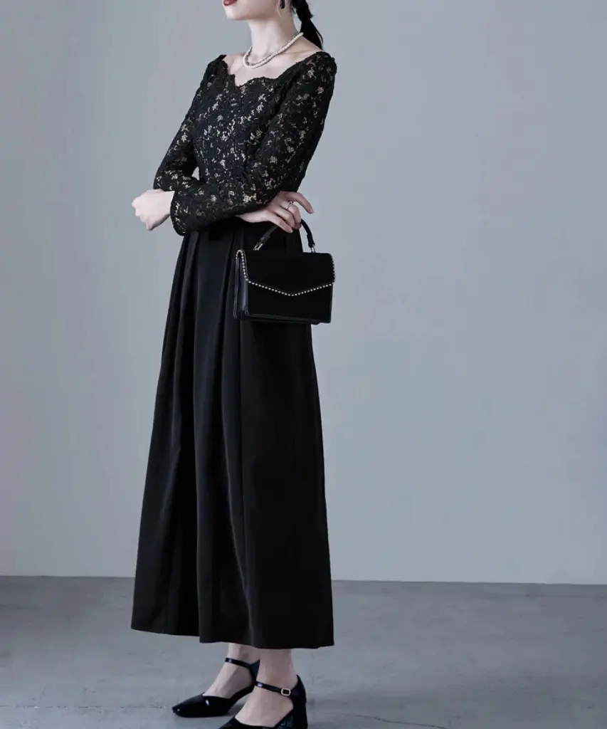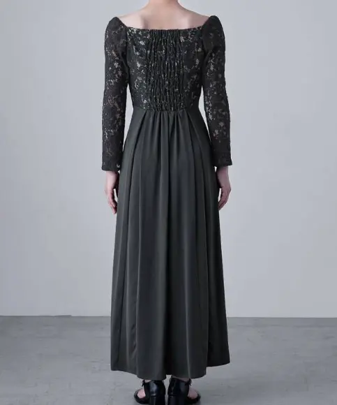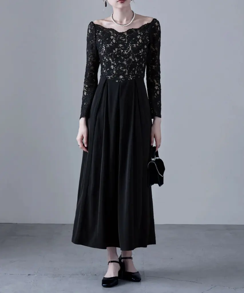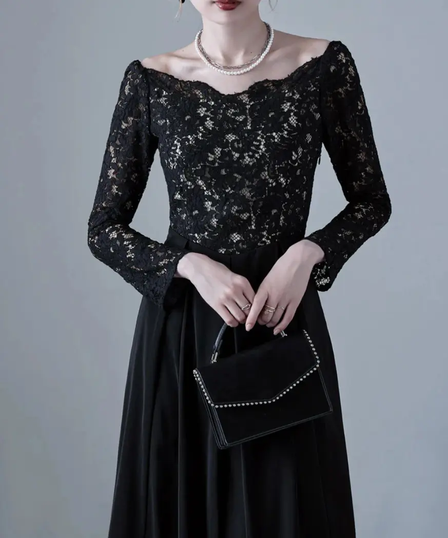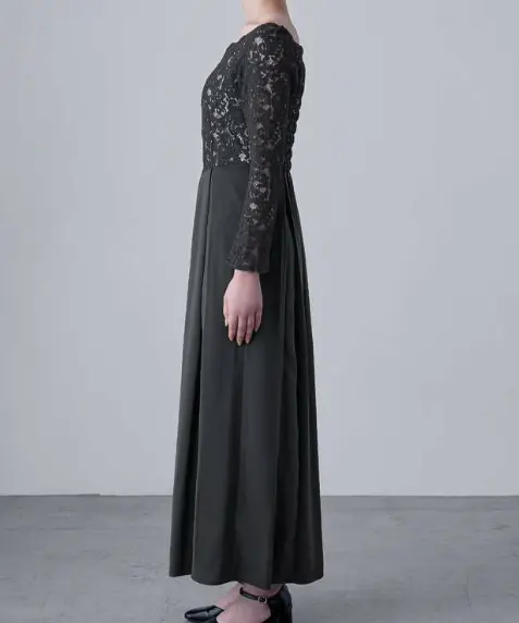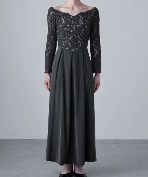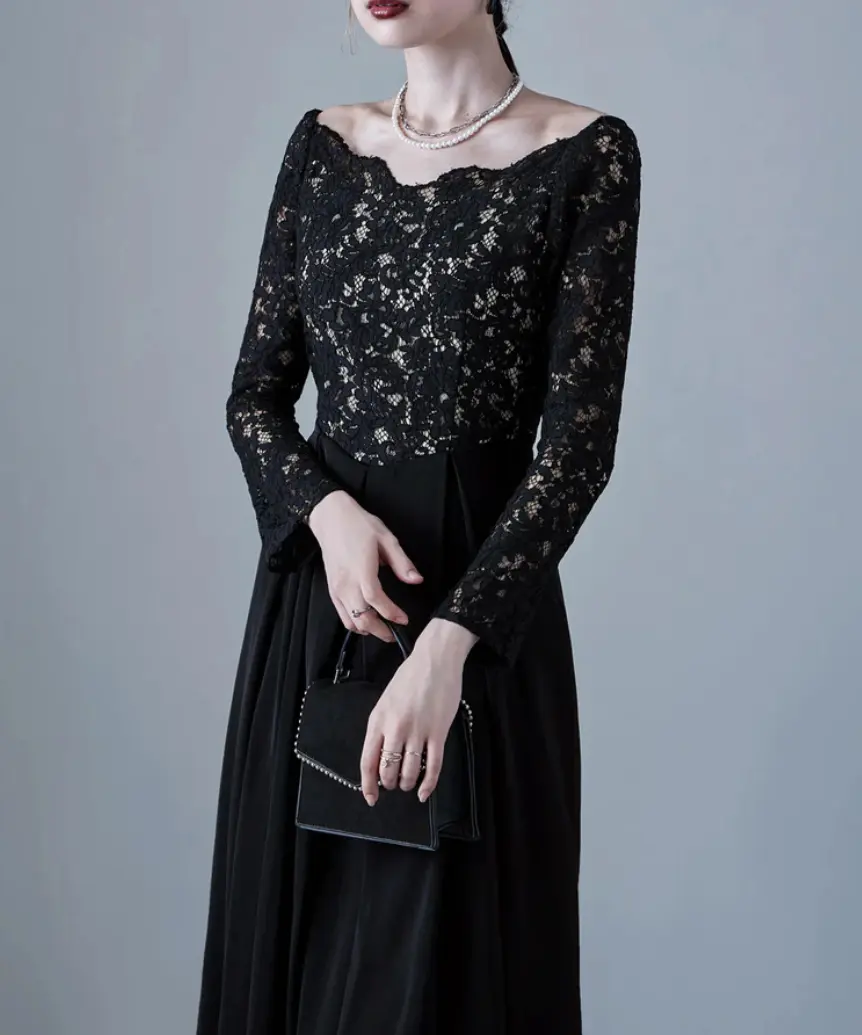 エレガントなバレエネックとフィット感のある長袖が特徴のロングドレスは、50年代を彷彿とさせるフィット&フレアのクラシカルなデザインが魅力です。肩に沿う緩やかなバレエネックやスカラップレースのネックラインが上品さを引き立て、大切な日やオケージョンシーンにふさわしい一着です。