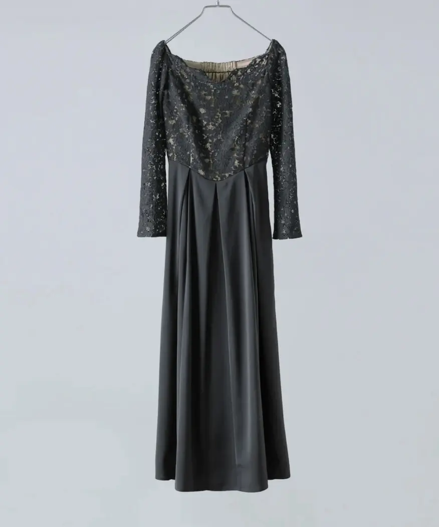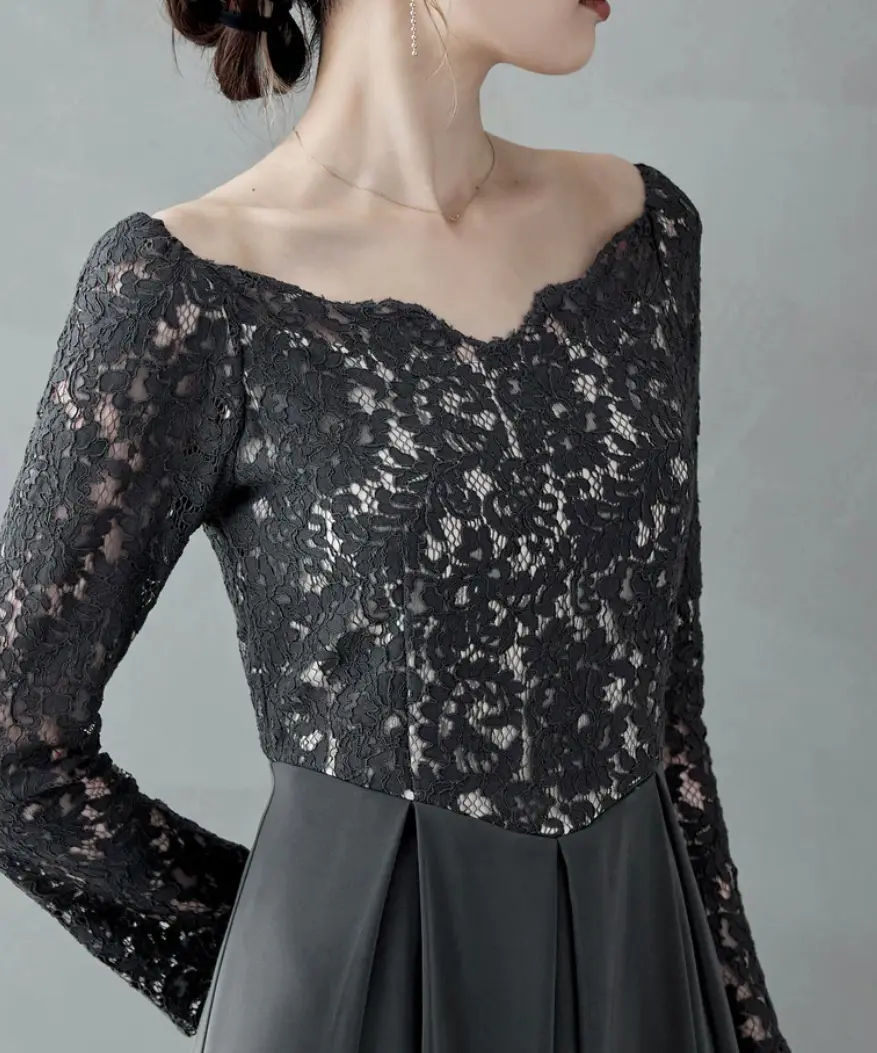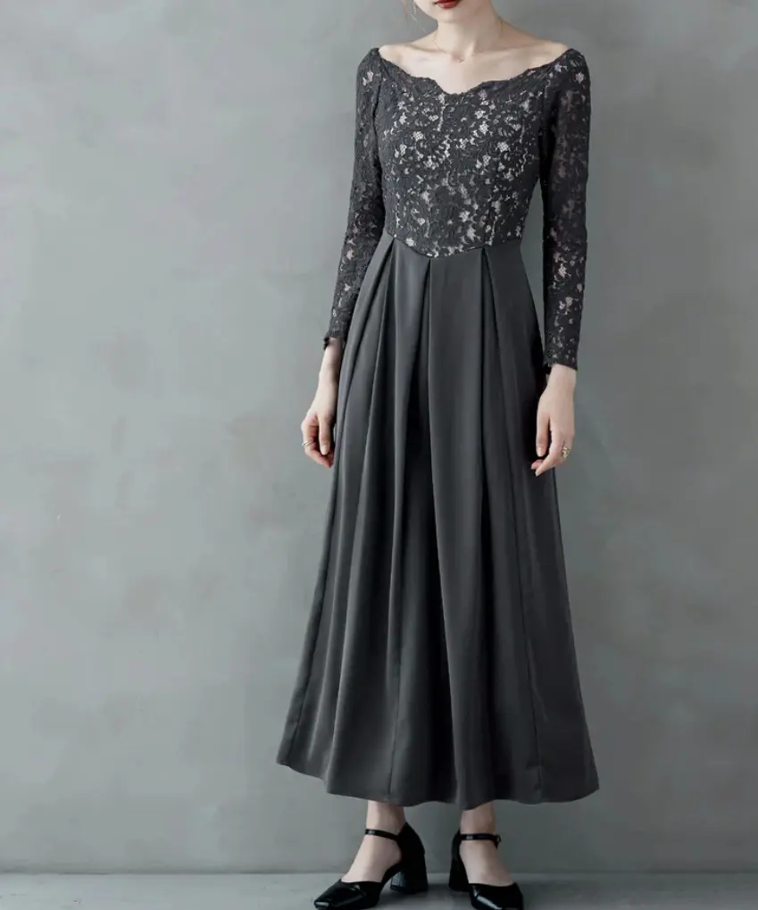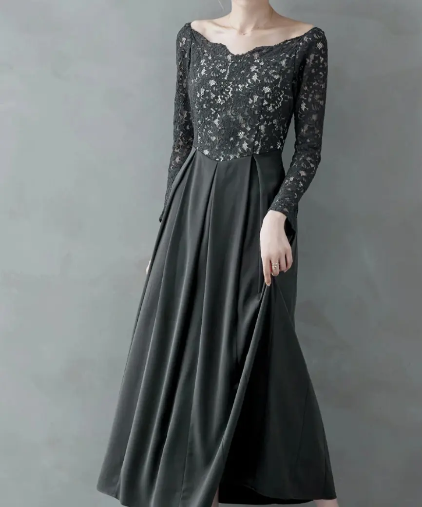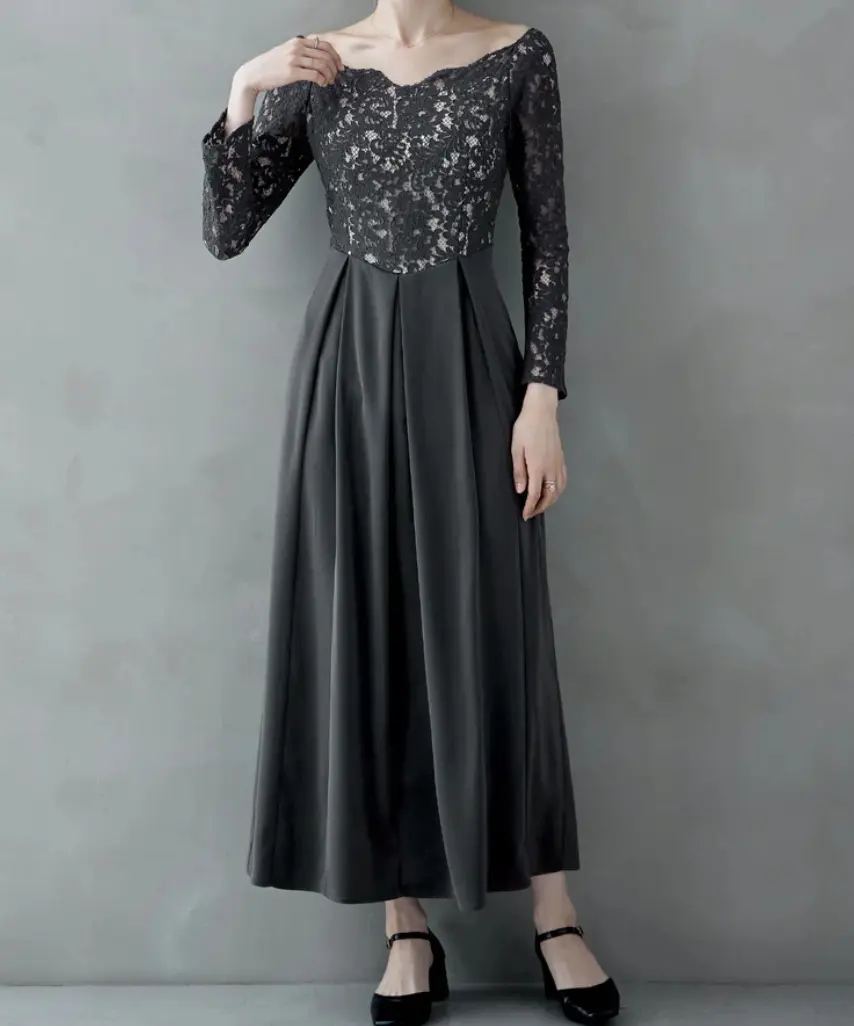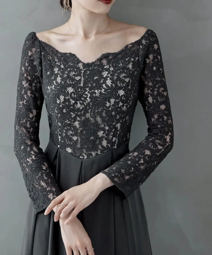 エレガントなバレエネックとフィット感のある長袖が特徴のロングドレスは、50年代を彷彿とさせるフィット&フレアのクラシカルなデザインが魅力です。肩に沿う緩やかなバレエネックやスカラップレースのネックラインが上品さを引き立て、大切な日やオケージョンシーンにふさわしい一着です。
