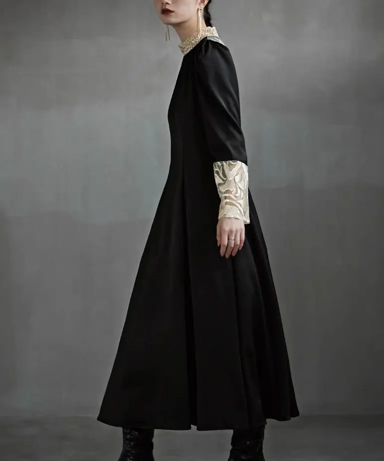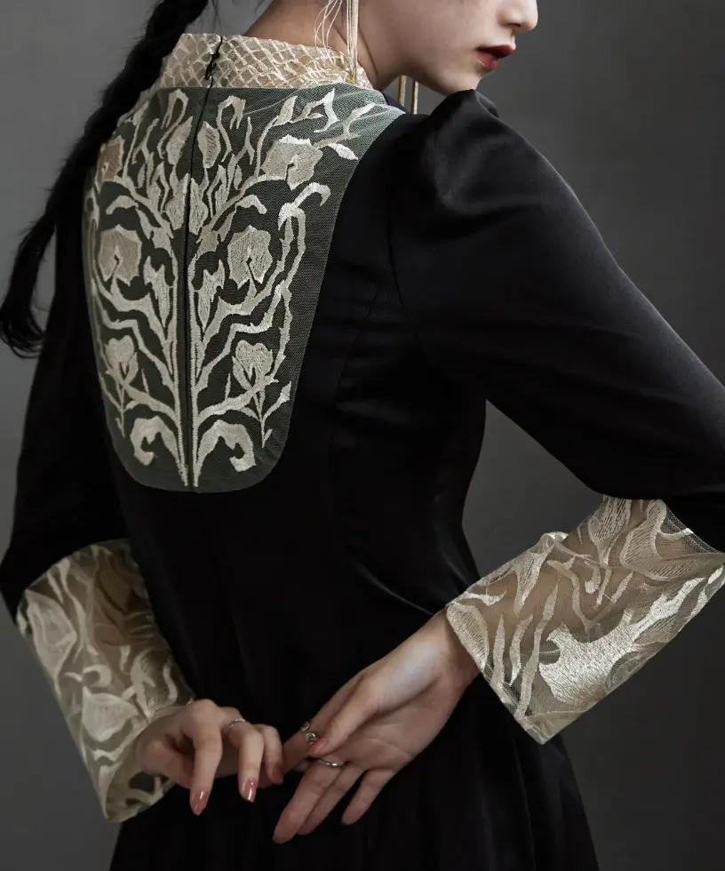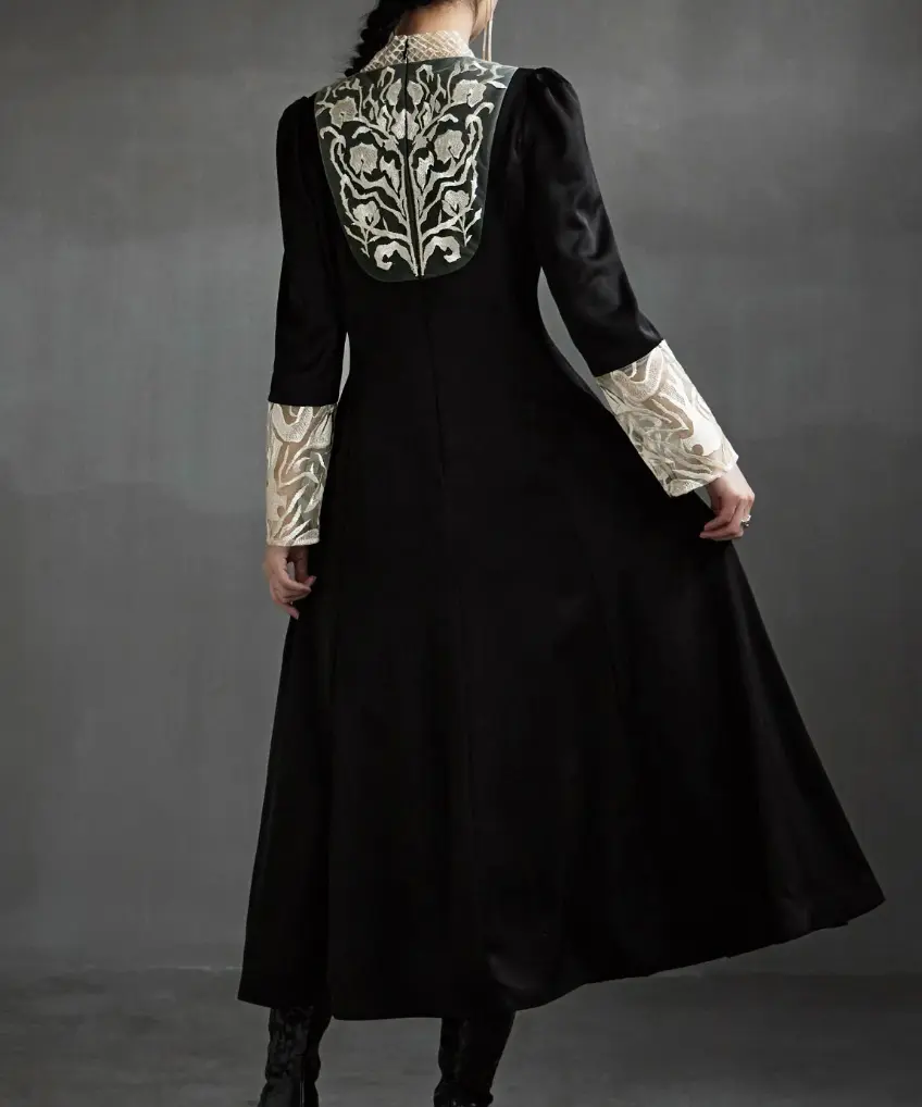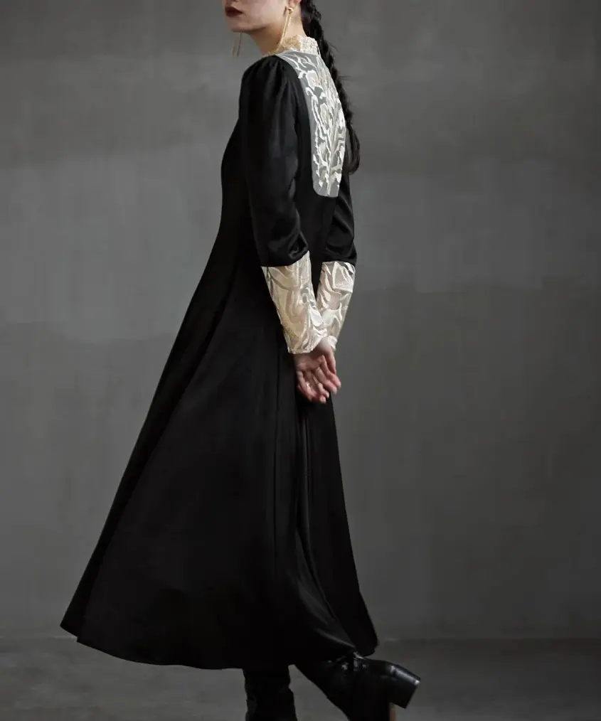 クラシカルとモードを兼ね備えたバック刺繍が目を惹くオケージョンドレスは、細部にこだわり「後ろ姿が美しく見える服」を目指して仕上げられました。50年代のフィット&フレアを彷彿とさせるシルエットと、マットなサテン生地に刺繍を施した華やかなデザインが特徴で、結婚式やパーティーはもちろんデイリーにも使える一着です。