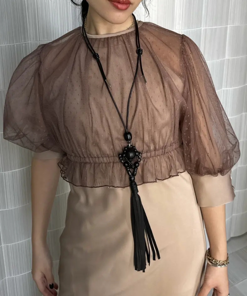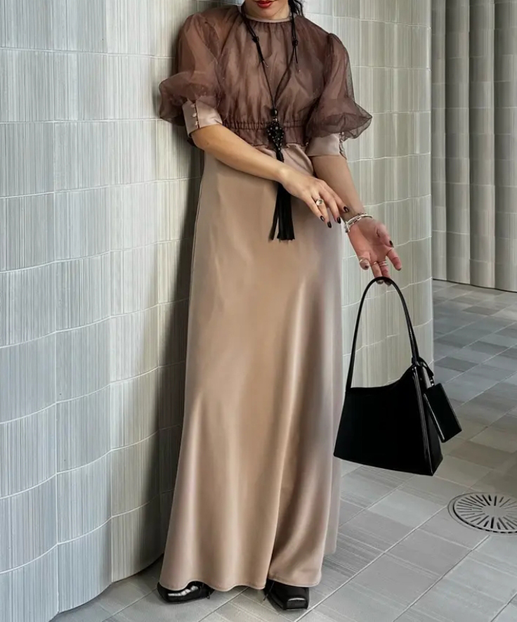 セミフレアのロングドレスとボレロのセットアイテムで、ドレスはシアー素材を使ったラグランデザインで、アメスリの抜け感を取り入れつつ肩周りをカバーします。