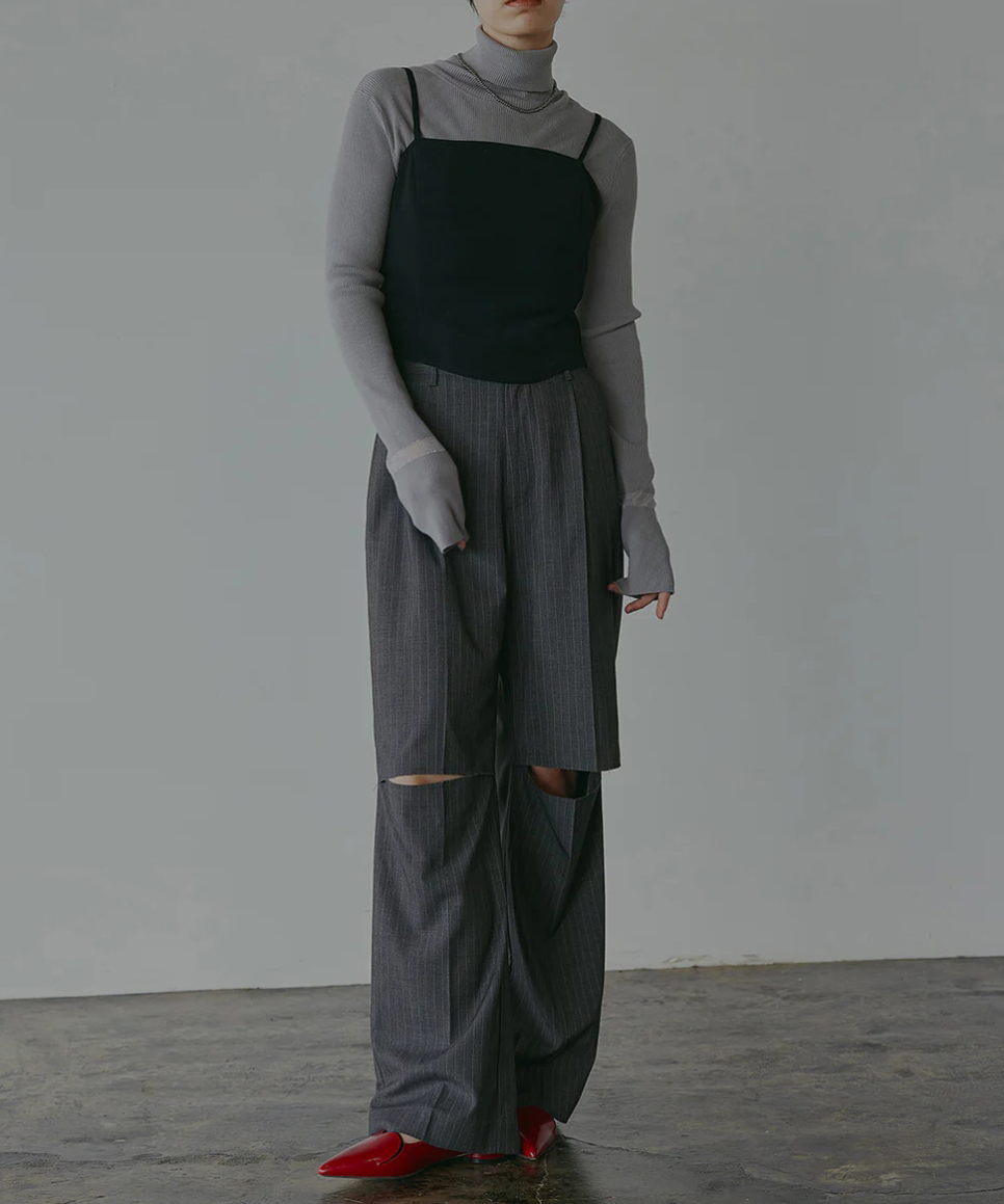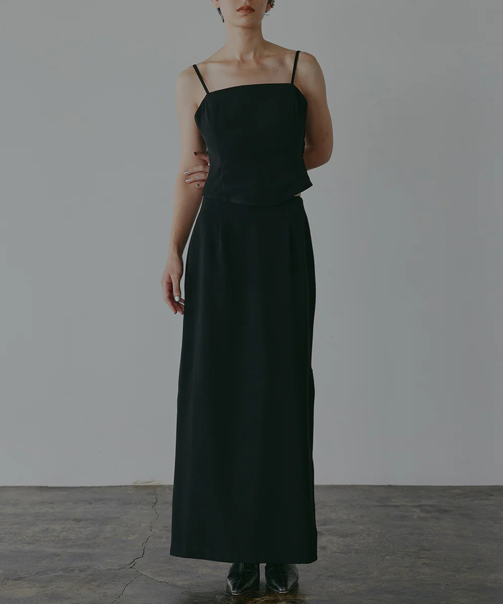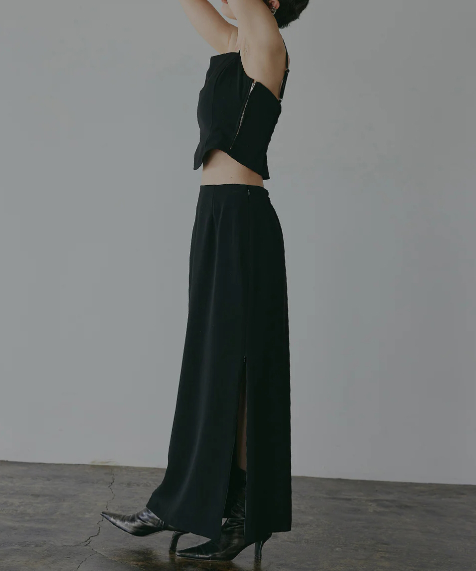 Iラインシルエットのスカートはスリットの長さを調整でき、ウエスト後ろはゴム仕様でリラックスしたフィット感があります。